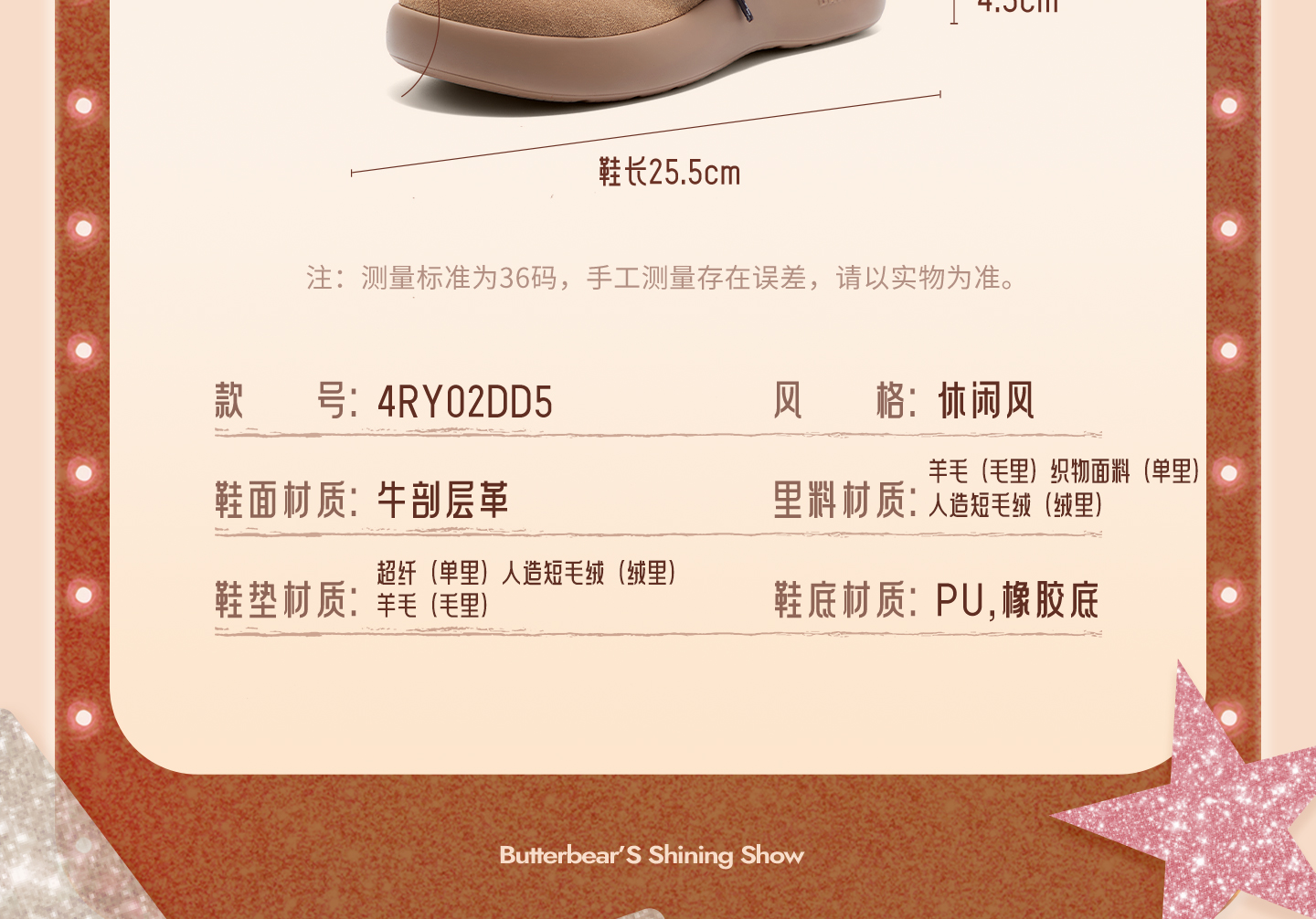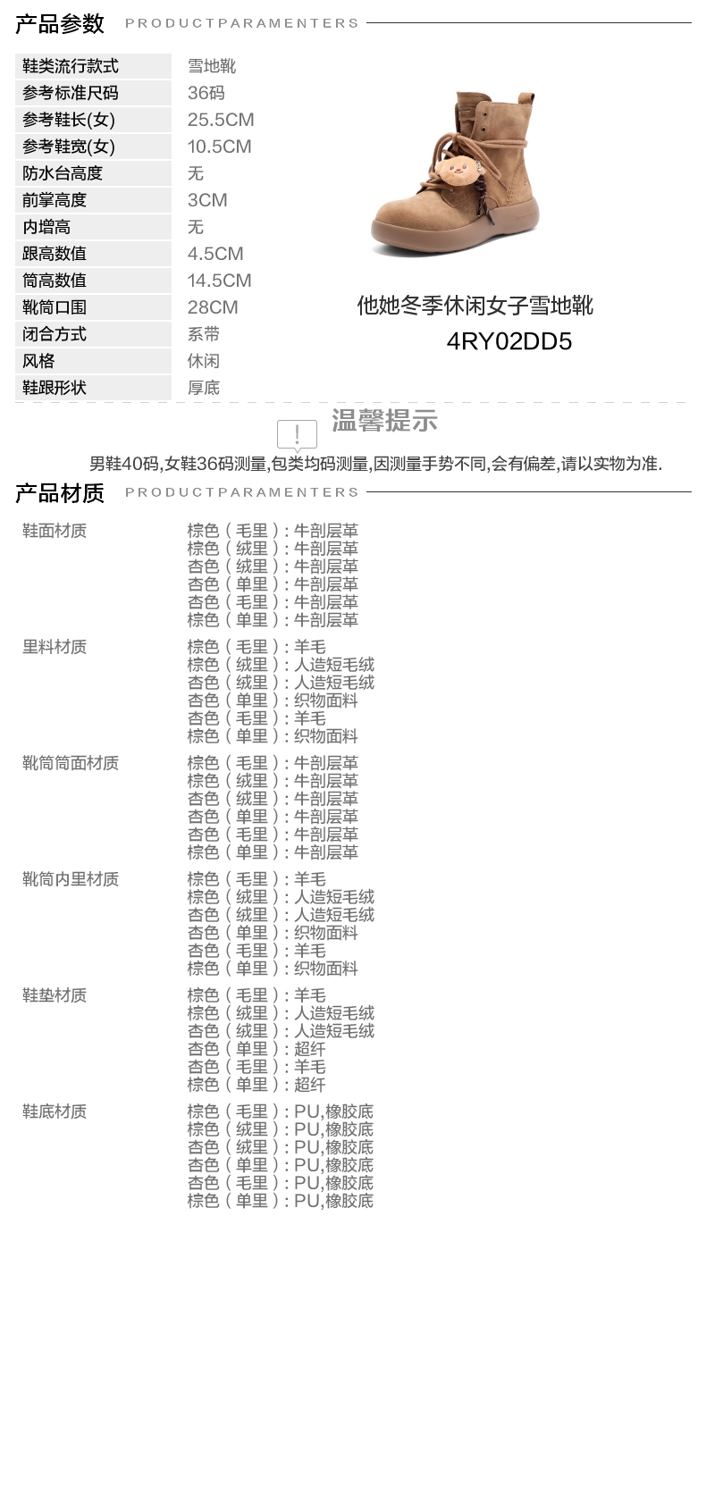 | 帮面材质:牛剖层革 | 配跟:无 | 靴筒口围:28CM | 上市时间:2025年冬季 | 鞋类流行款式:雪地靴 |