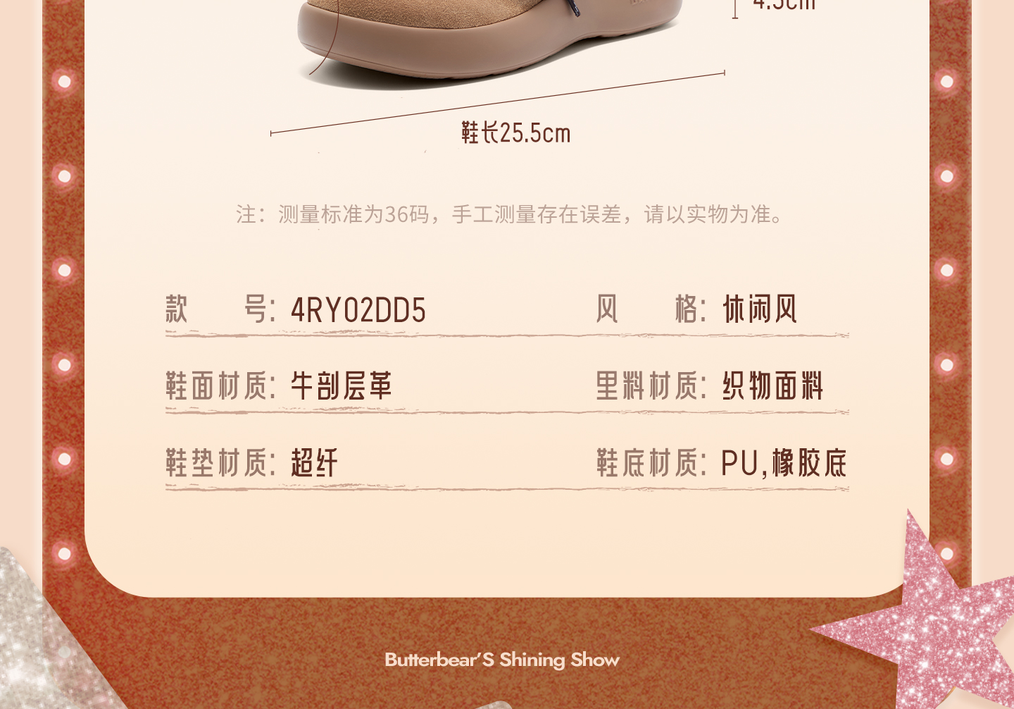 | 帮面材质:牛剖层革 | 配跟:无 | 靴筒口围:28CM | 上市时间:2025年冬季 | 鞋类流行款式:雪地靴 |