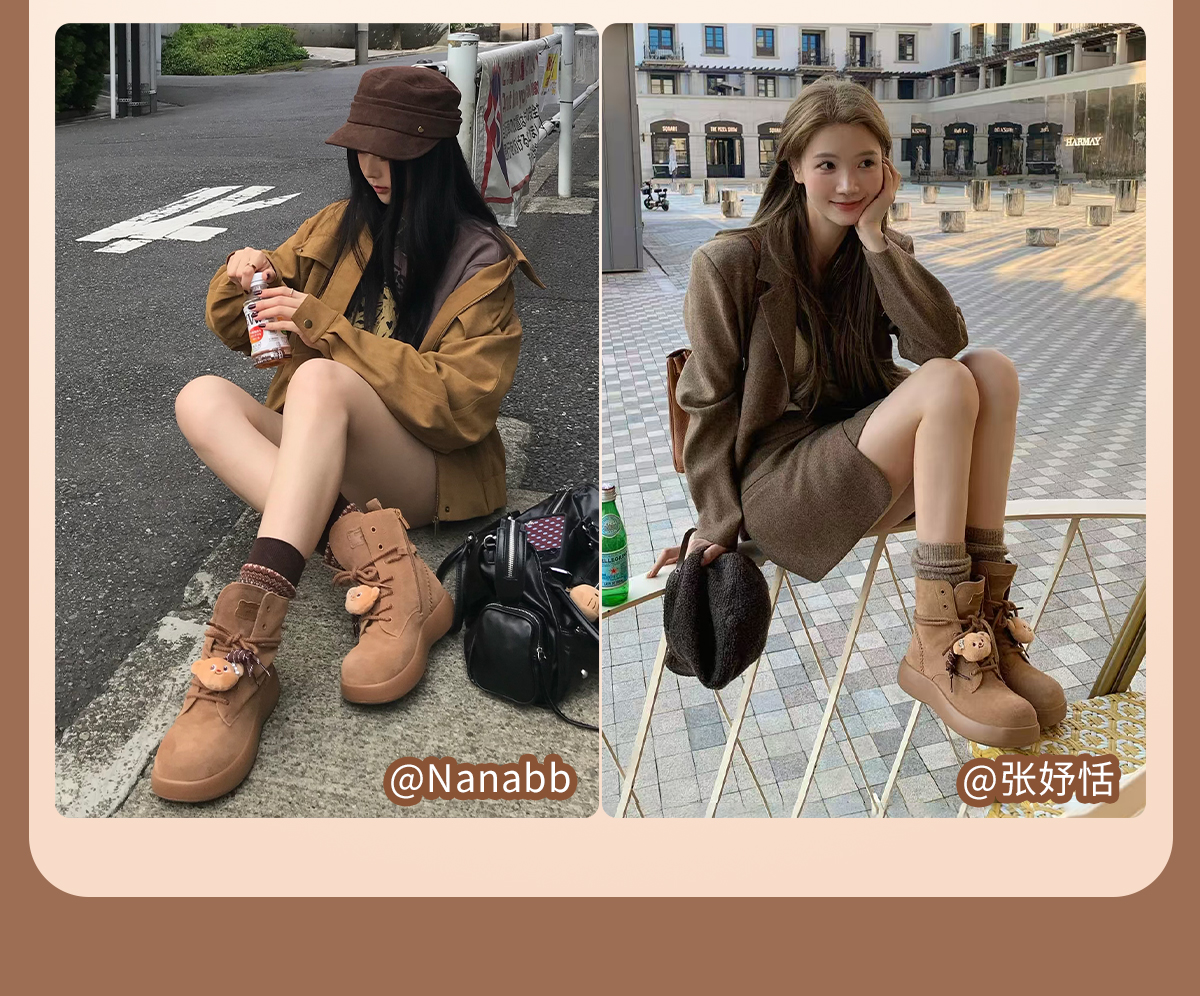 | 鞋底材质:橡胶底PU | 靴筒内里材质:人造短毛绒 | 内增高:无 | 鞋面材质:牛剖层革 | 闭合方式:系带 |