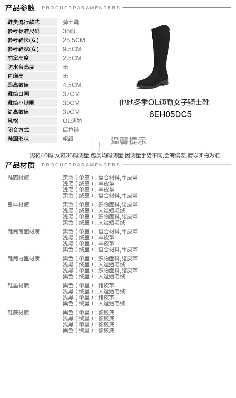 | 靴筒筒面材质:羊皮革 | 靴筒小腿围:30CM | 里料材质:人造短毛绒 | 制鞋工艺:胶贴皮鞋 | 鞋垫材质:人造短毛绒 |