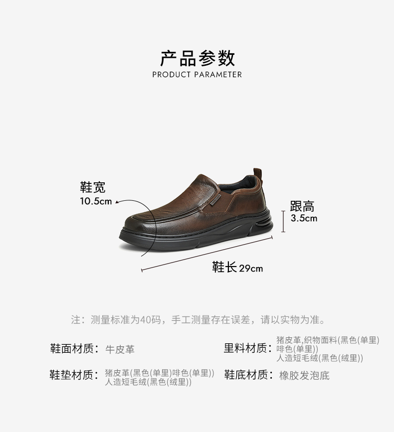 | 40码鞋长参考(男):29CM | 鞋帮:低帮 | 鞋底材质:橡胶发泡底 | 内增高:无 | 鞋面材质:牛皮革 |