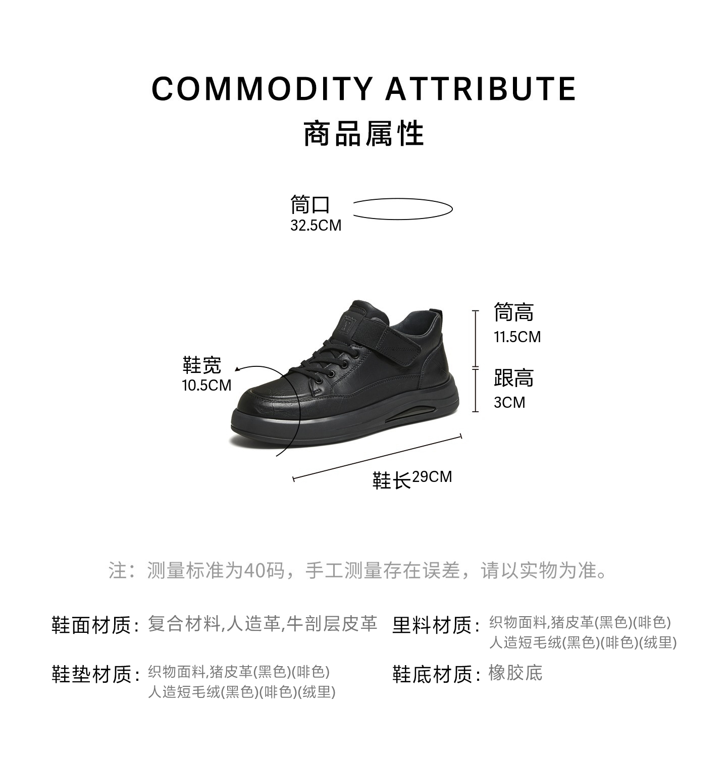 | 40码鞋长参考(男):29CM | 鞋底材质:橡胶底 | 靴筒内里材质:人造短毛绒 | 内增高:无 | 鞋面材质:牛剖层皮革人造革复合材料 |