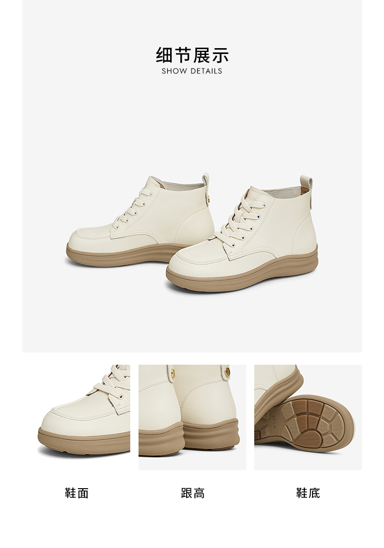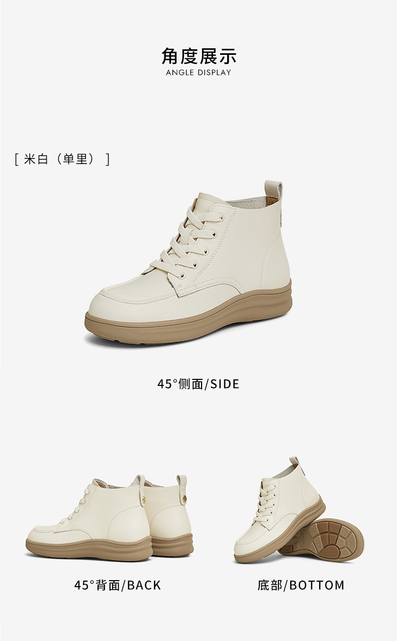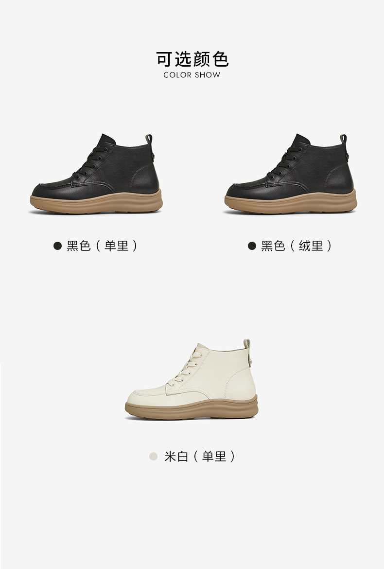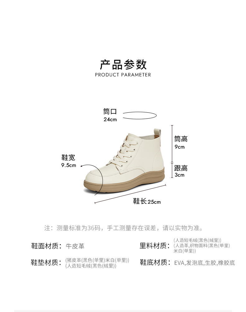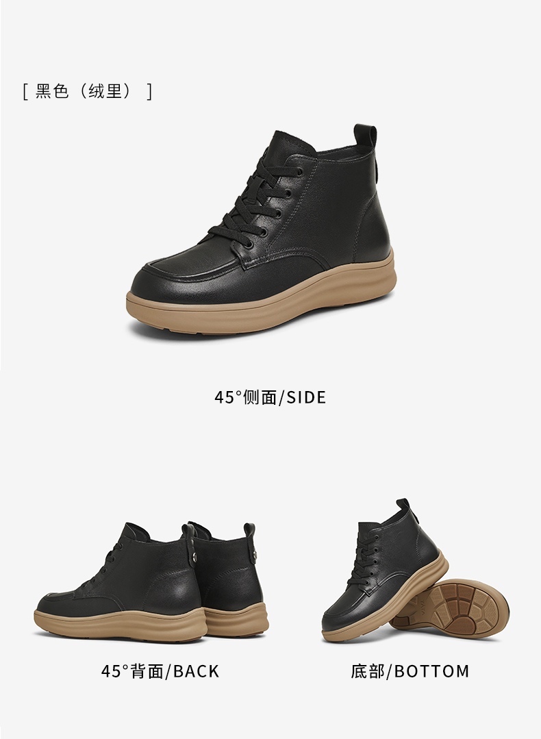 | 鞋底材质:EVA生胶橡胶底发泡底 | 靴筒内里材质:织物面料人造革 | 内增高:无 | 鞋面材质:牛皮革 | 闭合方式:系带 |