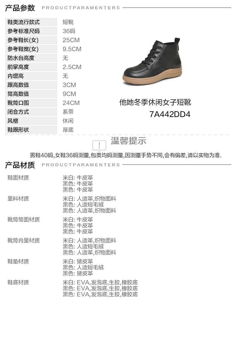 | 参考鞋宽(女):9.5CM | 风格:休闲 | 色系:黑色 | 跟高数值:3CM | 筒高数值:9CM |