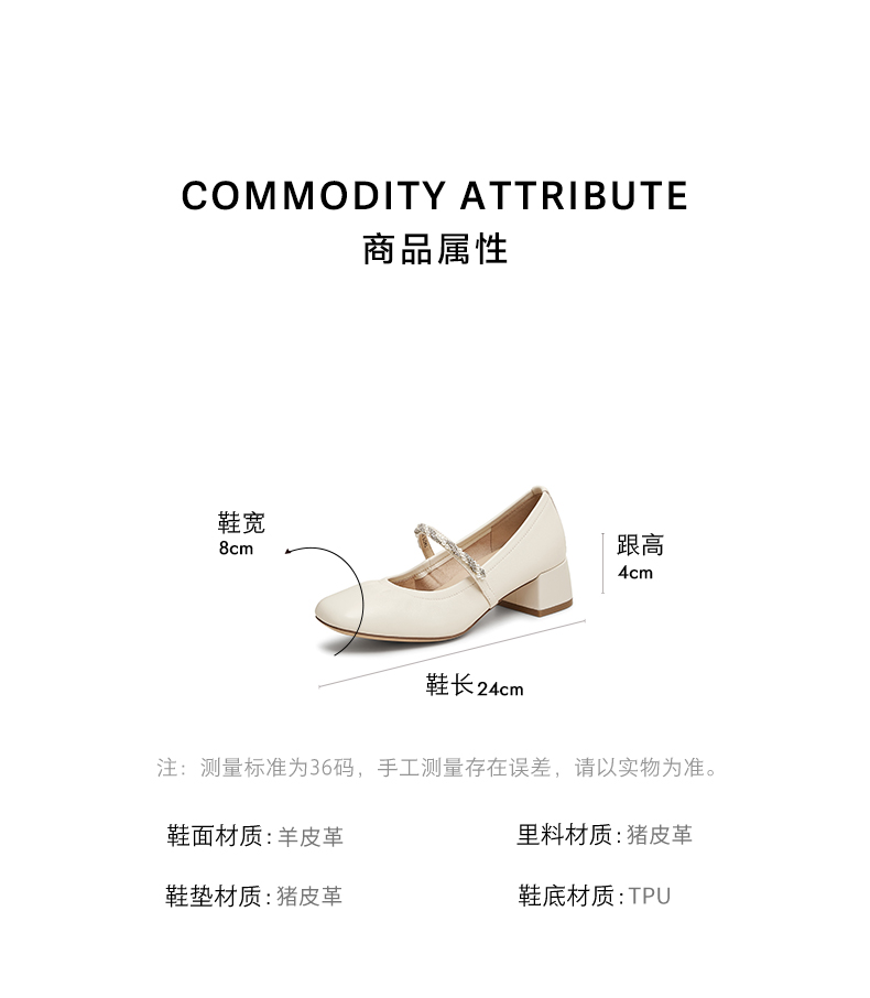 | 参考标准尺码:36码 | 跟高数值:4CM | 性别:女子 | 里料材质:猪皮革 | 制鞋工艺:胶贴皮鞋 |