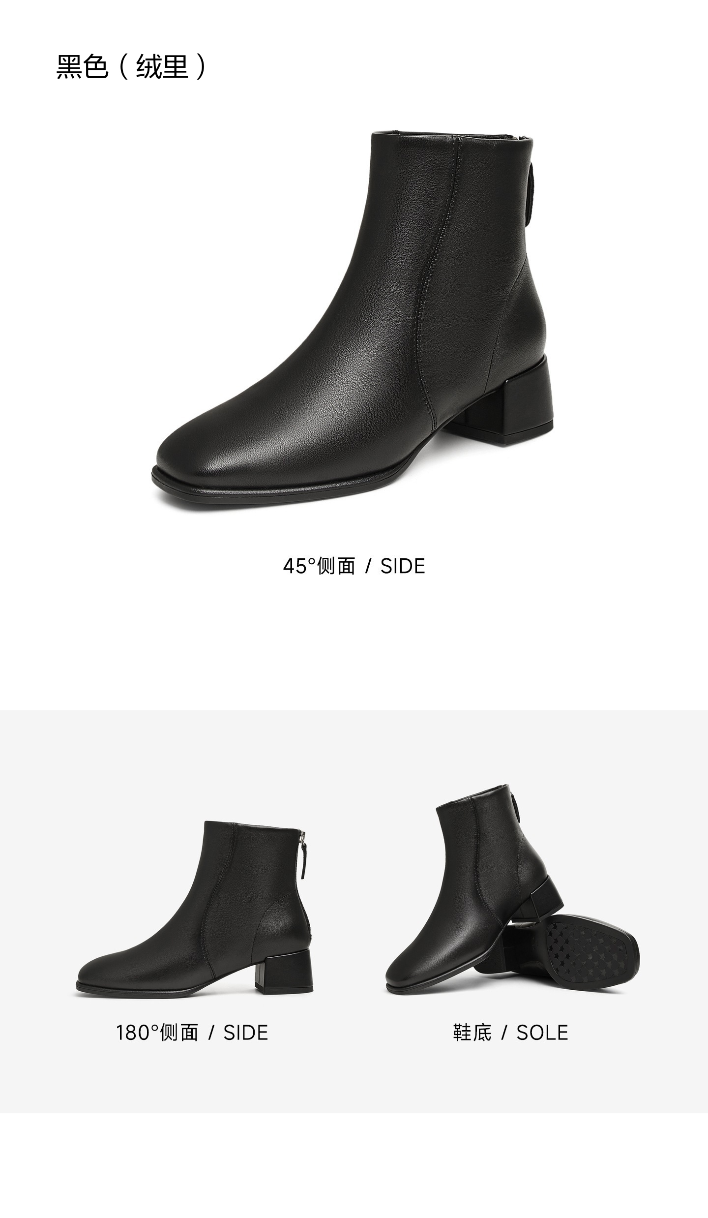 | 鞋底材质:TPU | 靴筒内里材质:织物面料 | 内增高:无 | 鞋面材质:羊皮革 | 闭合方式:后拉链 |