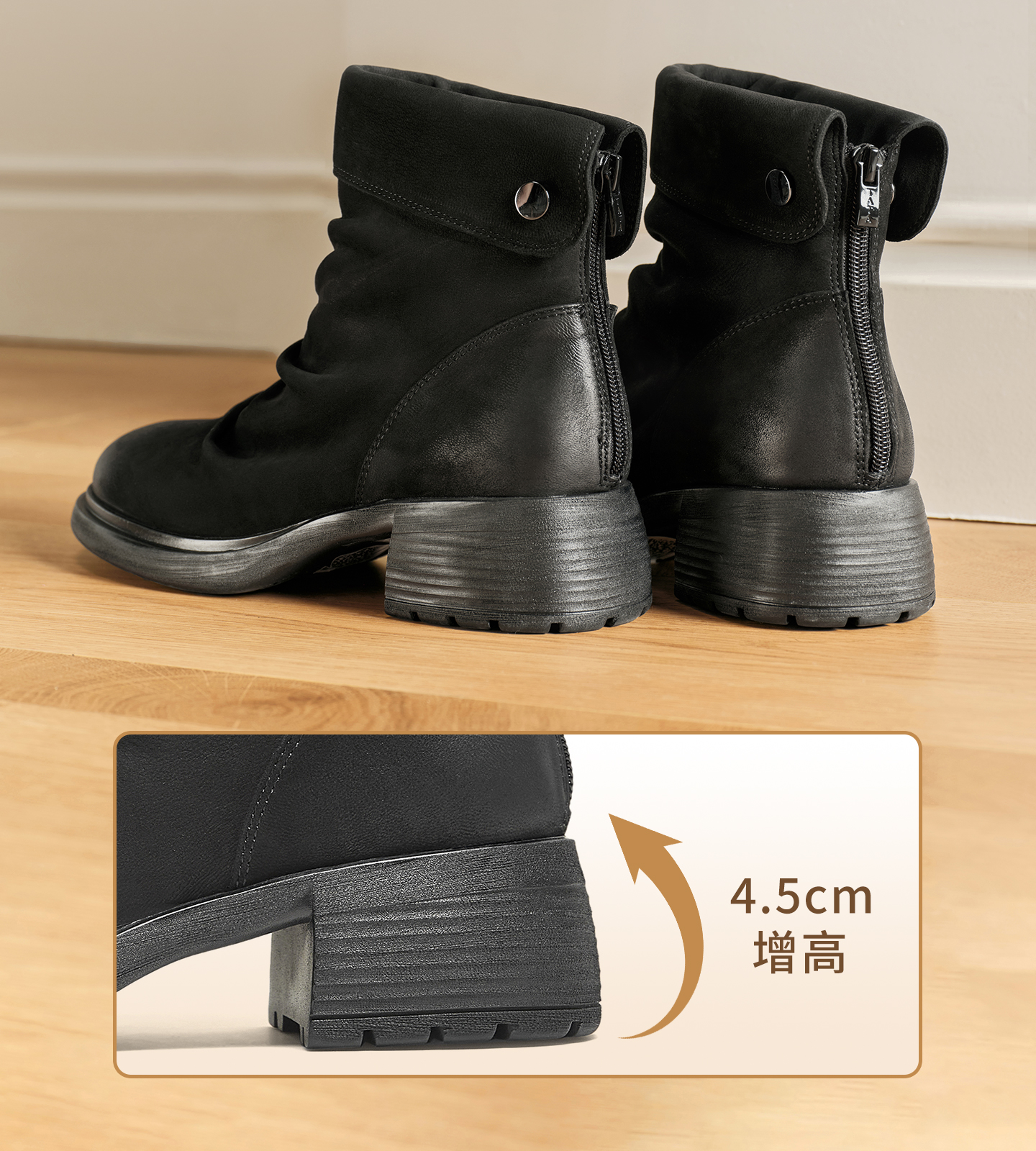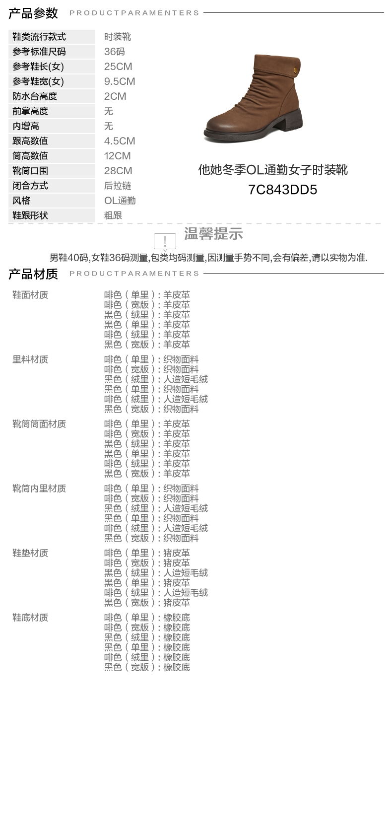 | 鞋底材质:橡胶底 | 靴筒内里材质:人造短毛绒 | 鞋面材质:羊皮革 | 闭合方式:后拉链 | 靴筒口围:28CM |