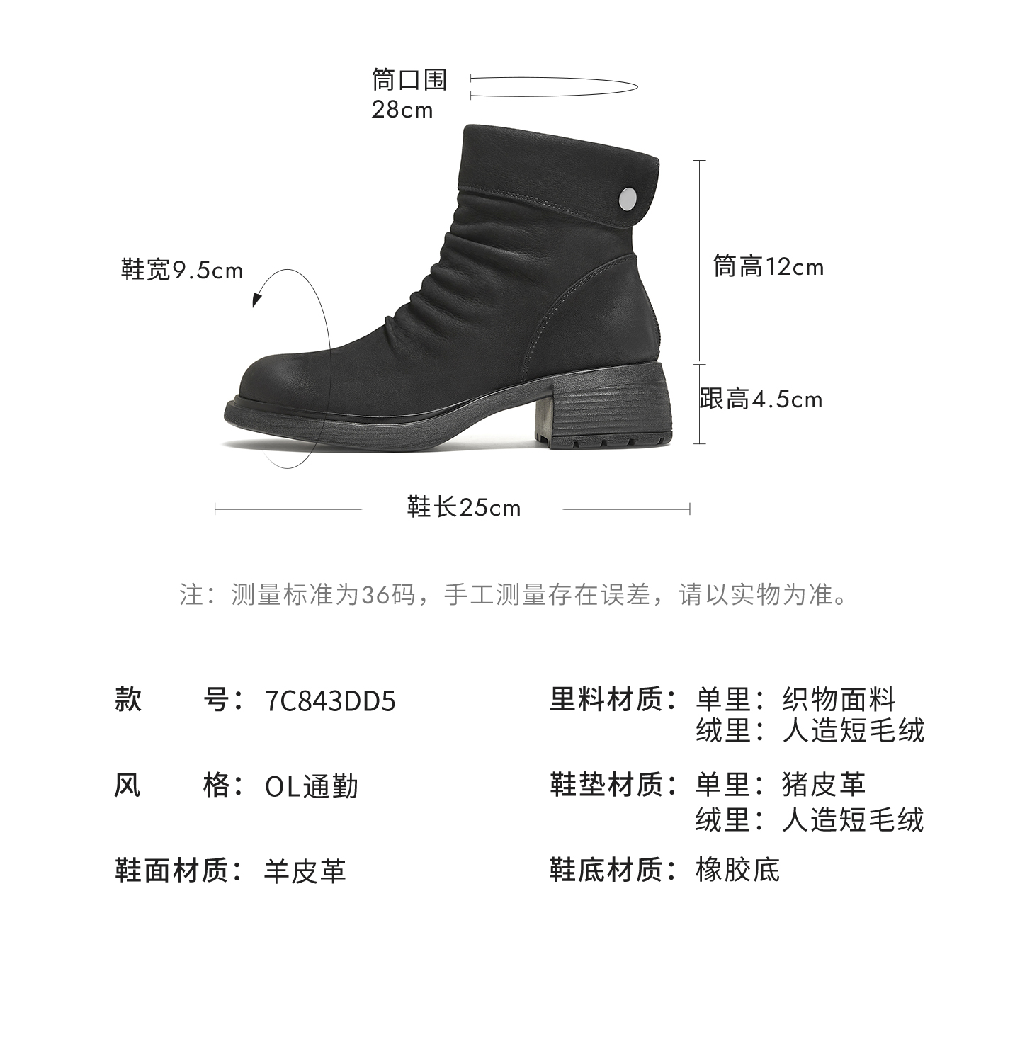 | 帮面材质:羊皮 | 配跟:有 | 上市时间:2025年冬季 | 鞋类流行款式:时装靴 | 鞋头款式:圆头 |