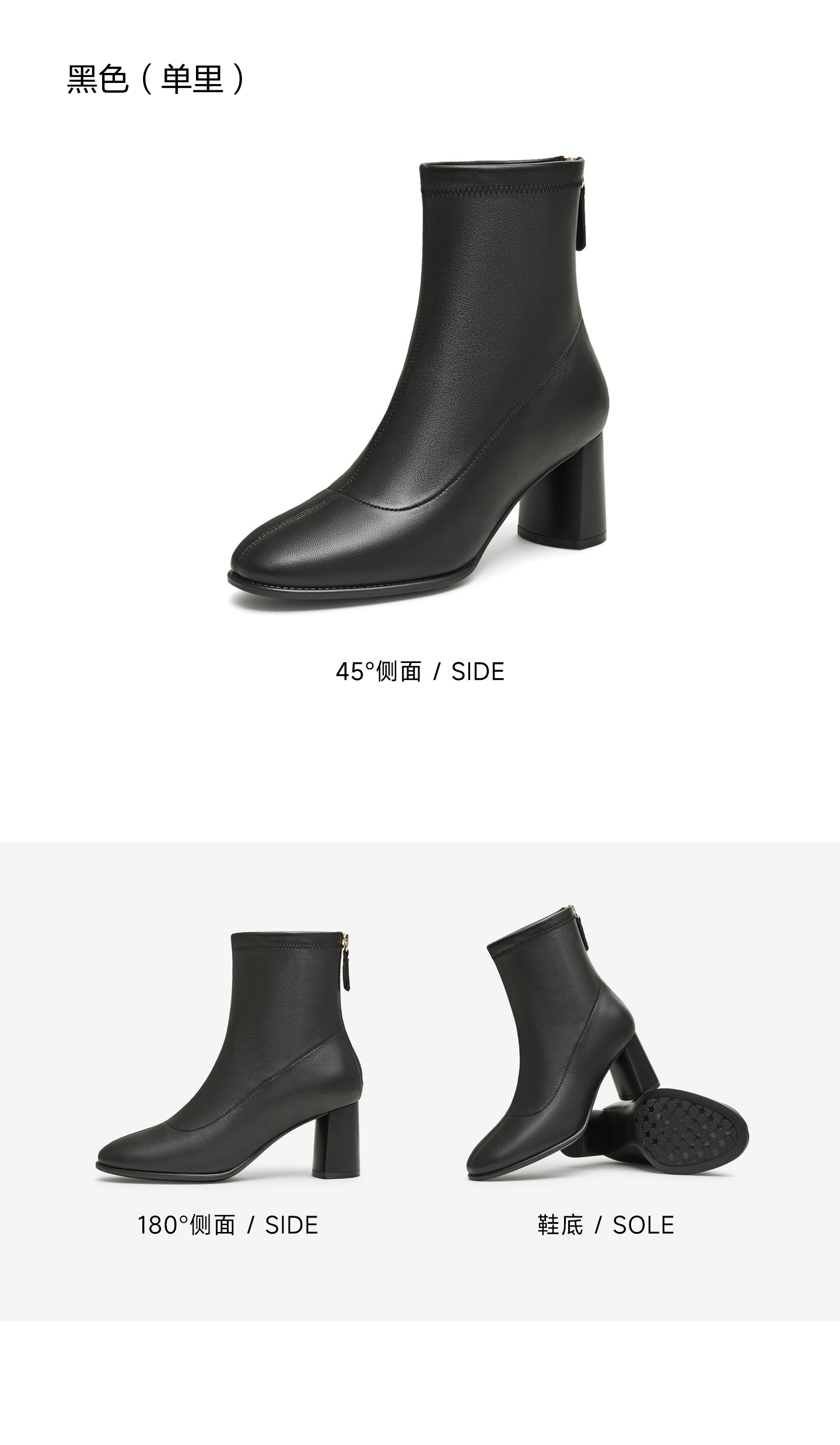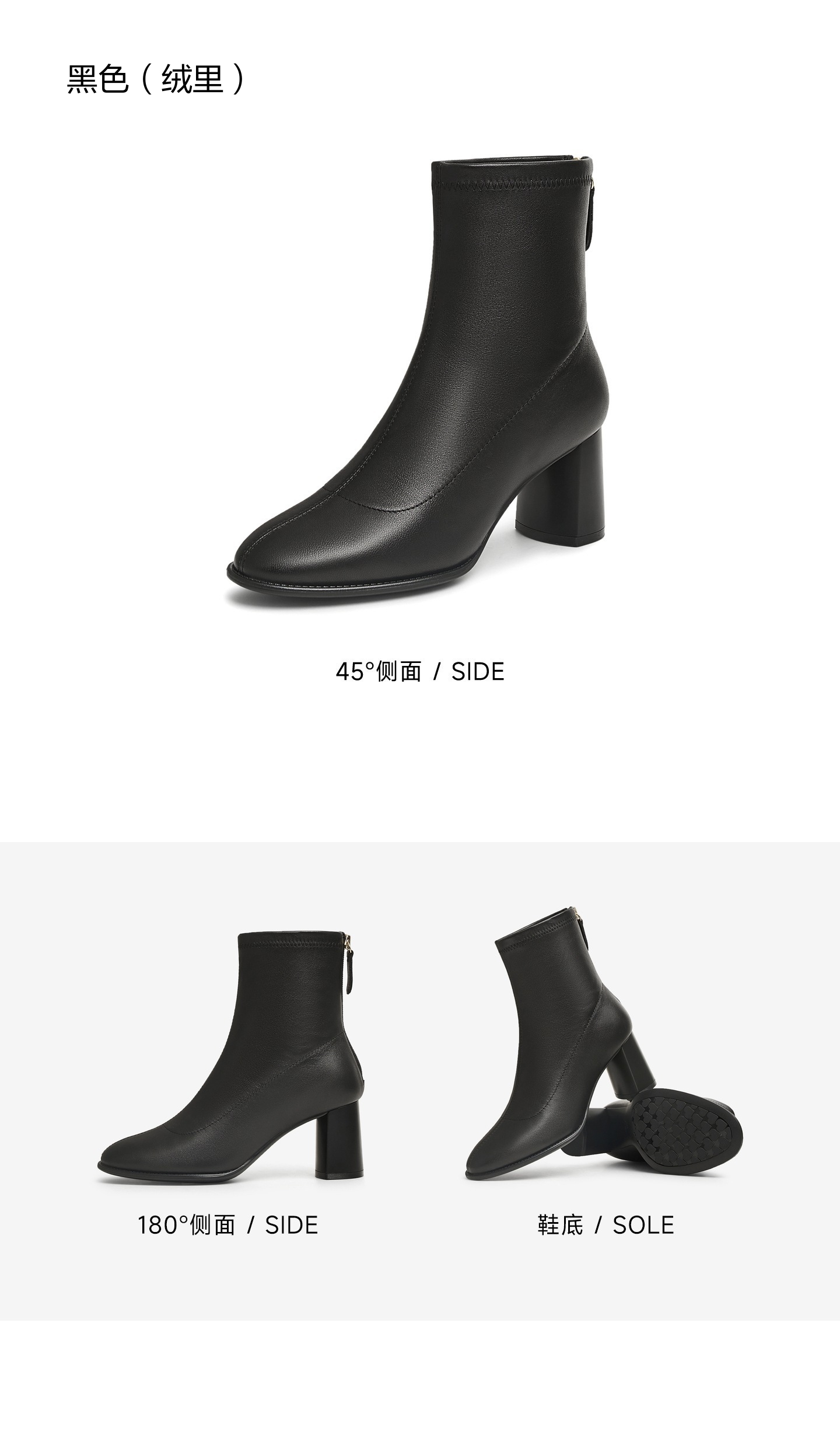 | 鞋底材质:TPU | 靴筒内里材质:织物面料 | 内增高:无 | 鞋面材质:羊皮革 | 闭合方式:后拉链 |