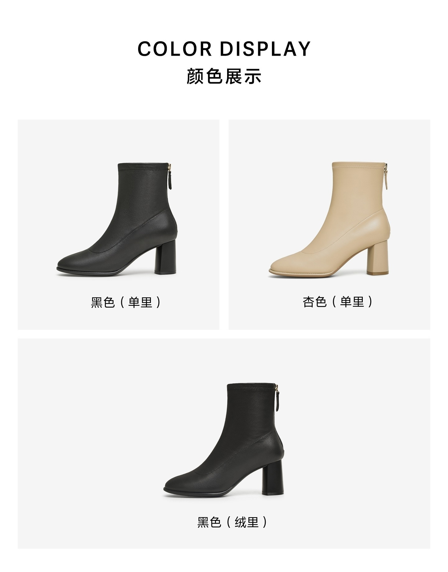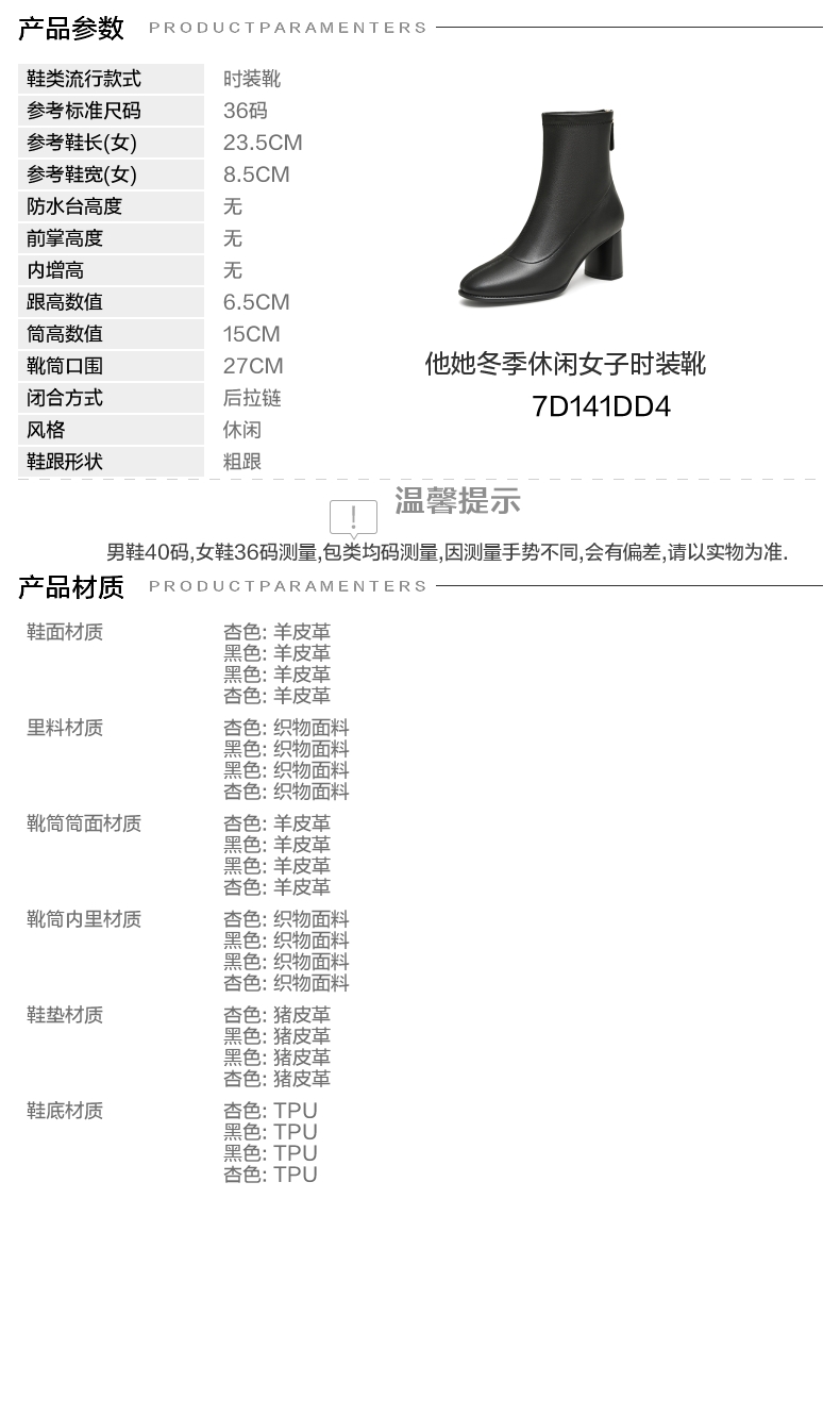 | 鞋底材质:TPU | 靴筒内里材质:织物面料 | 内增高:无 | 鞋面材质:羊皮革 | 闭合方式:后拉链 |