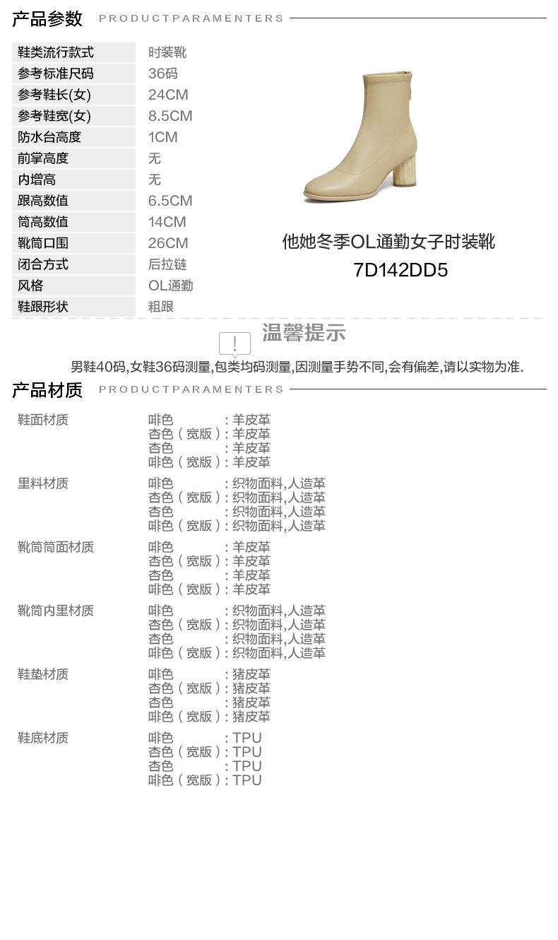 | 参考鞋宽(女):8.5CM | 风格:OL通勤 | 色系:杏色 | 跟高数值:6.5CM | 筒高数值:14CM |