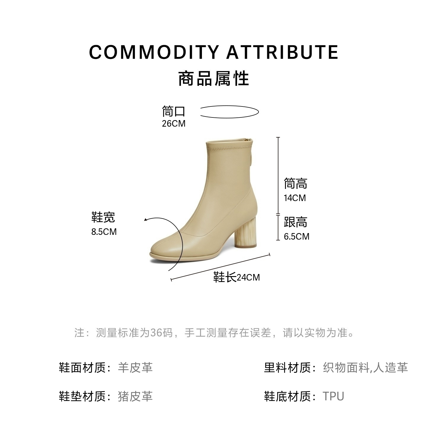 | 参考鞋宽(女):9CM | 风格:OL通勤 | 色系:杏色 | 跟高数值:6.5CM | 筒高数值:14CM |