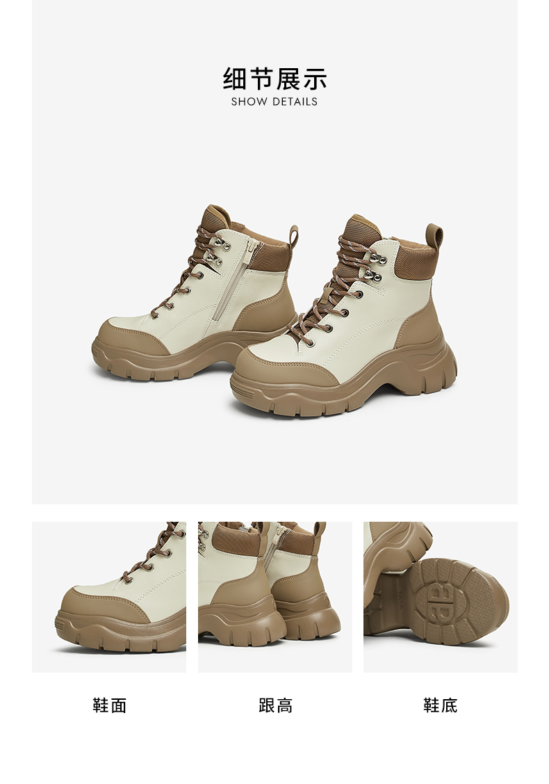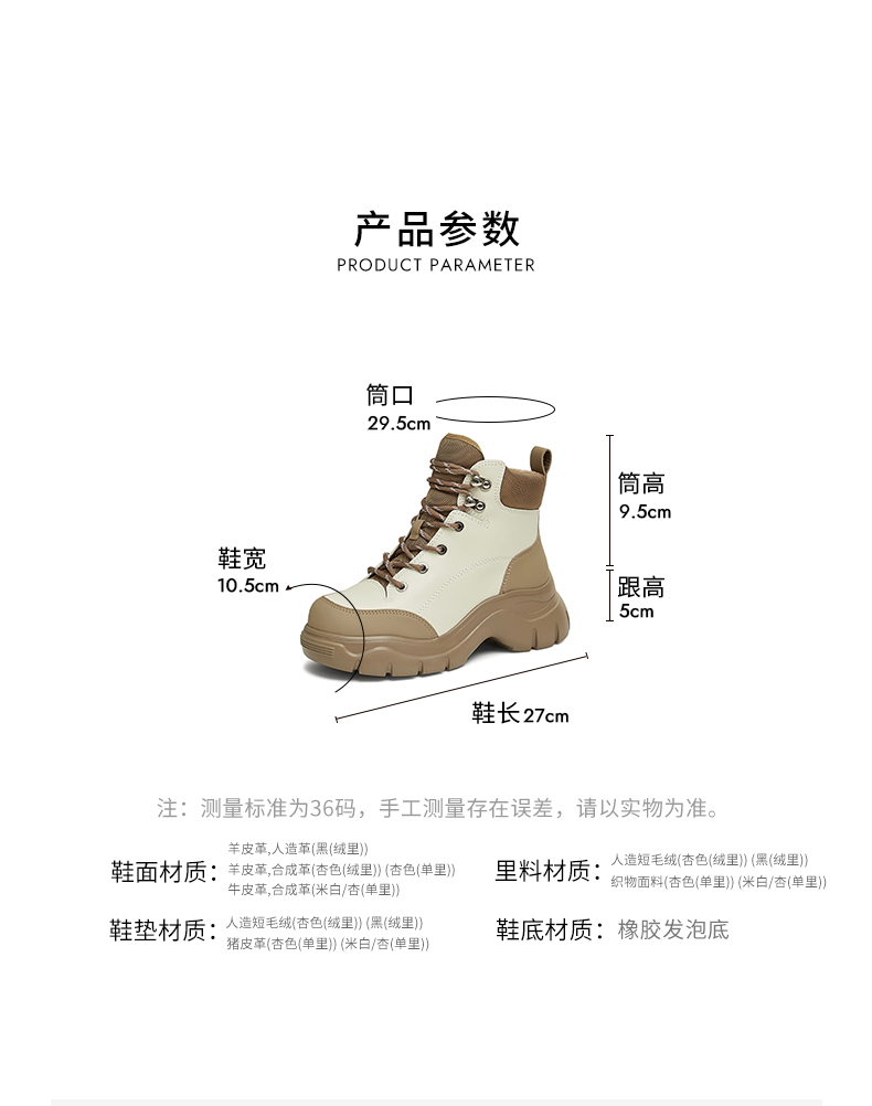 | 鞋底材质:橡胶发泡底 | 靴筒内里材质:织物面料 | 内增高:无 | 鞋面材质:合成革牛皮革 | 闭合方式:系带 |