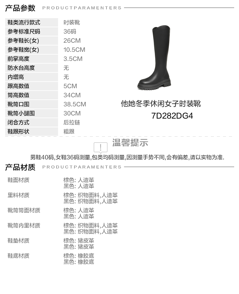 | 色系:黑色 | 参考标准尺码:36码 | 跟高数值:5CM | 筒高数值:34CM | 性别:女子 |