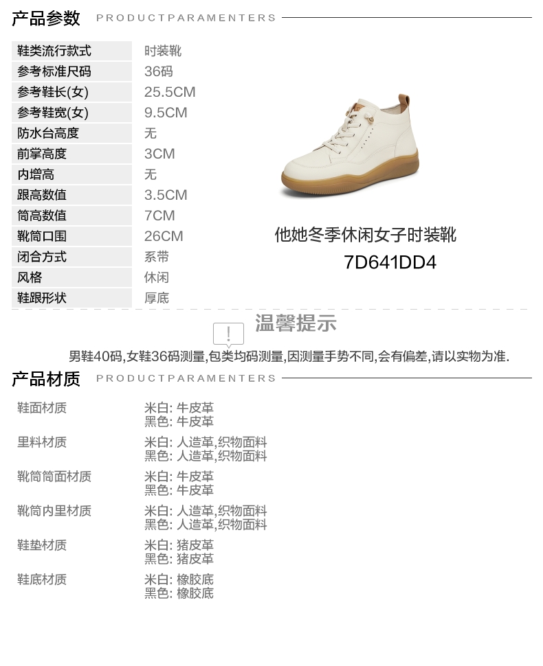 | 参考鞋宽(女):9.5CM | 风格:休闲 | 色系:黑色 | 跟高数值:3.5CM | 筒高数值:7CM |
