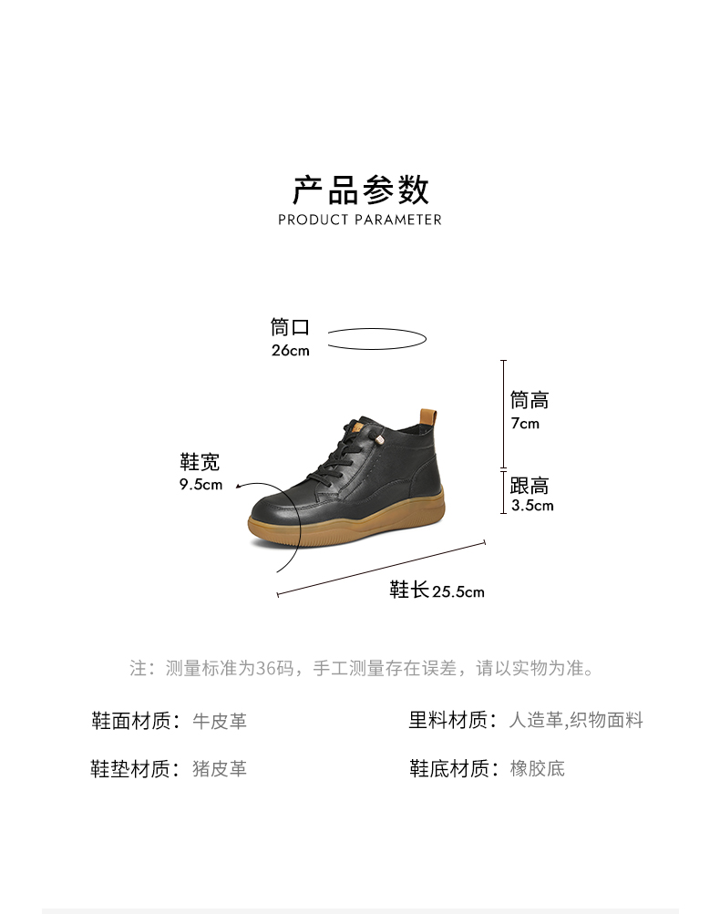 | 鞋底材质:橡胶底 | 靴筒内里材质:织物面料人造革 | 内增高:无 | 鞋面材质:牛皮革 | 闭合方式:系带 |
