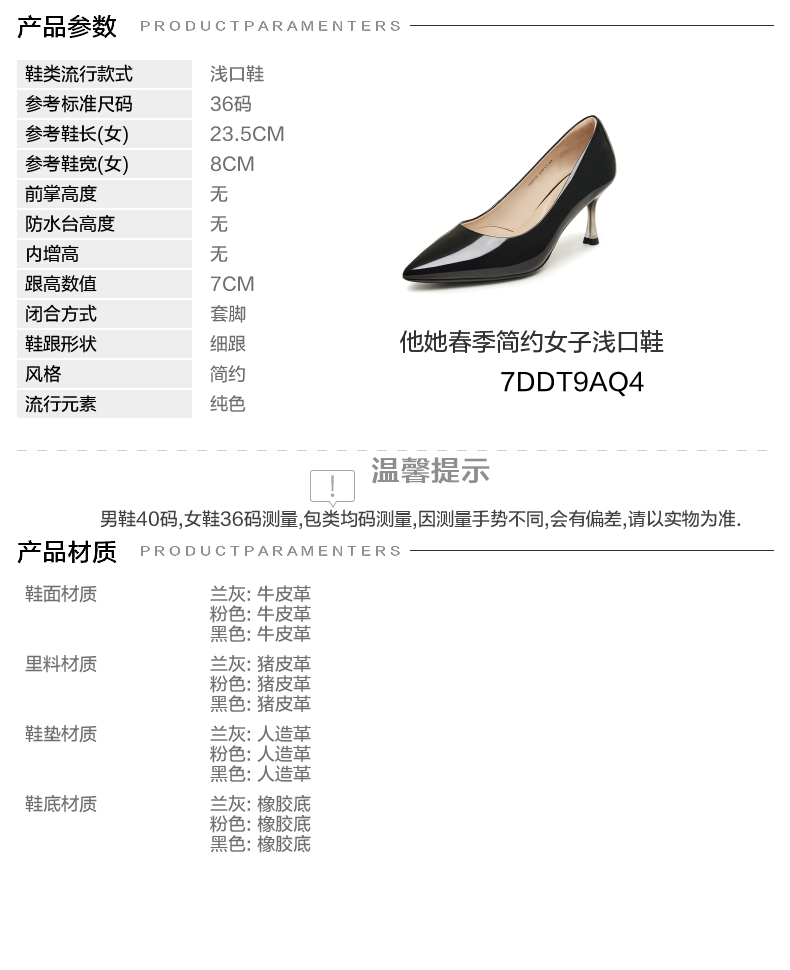 | 参考标准尺码:36码 | 跟高数值:7CM | 集团旧货: | 性别:女子 | 里料材质:猪皮革 |