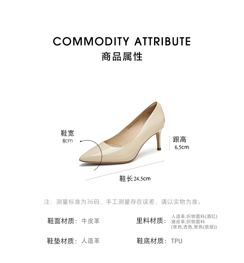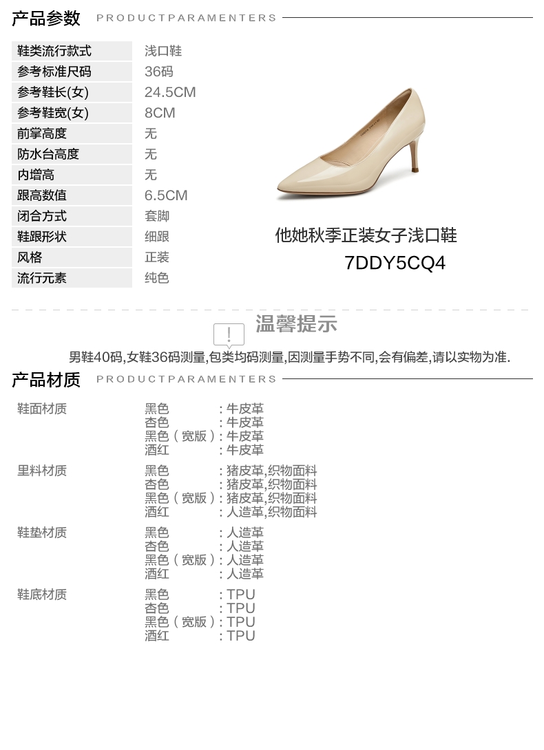 | 跟高数值:6.5CM | 性别:女子 | 里料材质:织物面料猪皮革 | 制鞋工艺:胶贴皮鞋 | 款式季节:秋季 |