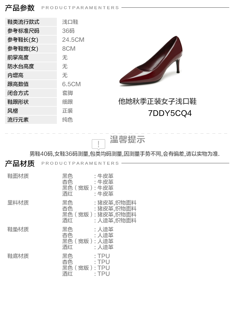 | 生产/经销/进口厂家:丽荣鞋业(深圳)有限公司 | 鞋类流行款式:浅口鞋 | 鞋头款式:尖头 | 执行标准:皮鞋 QB/T1002-2015 | 跟高范围:高跟鞋(6-8CM) |