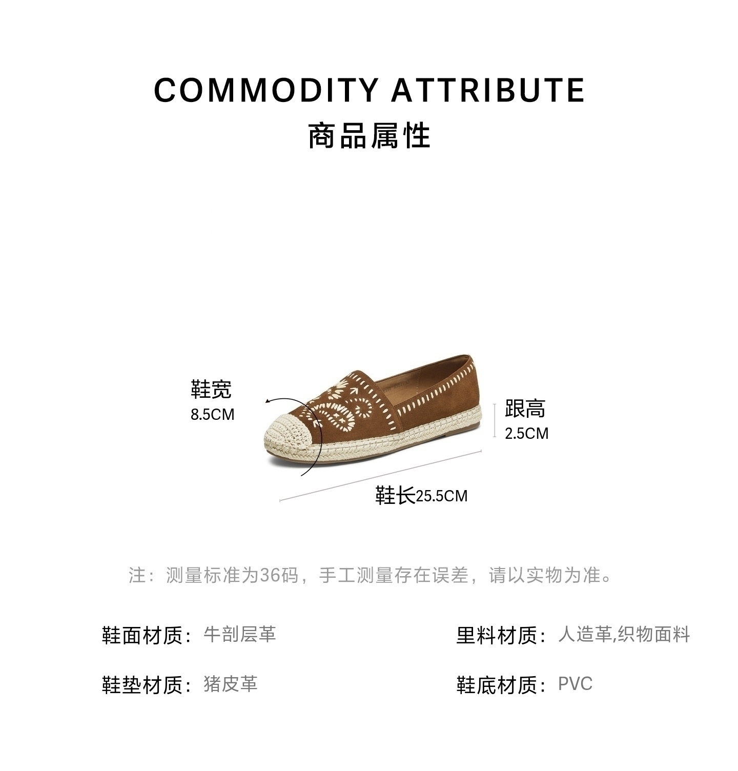 | 色系:棕色 | 跟高数值:2.5CM | 性别:女子 | 里料材质:织物面料人造革 | 制鞋工艺:胶贴皮鞋 |