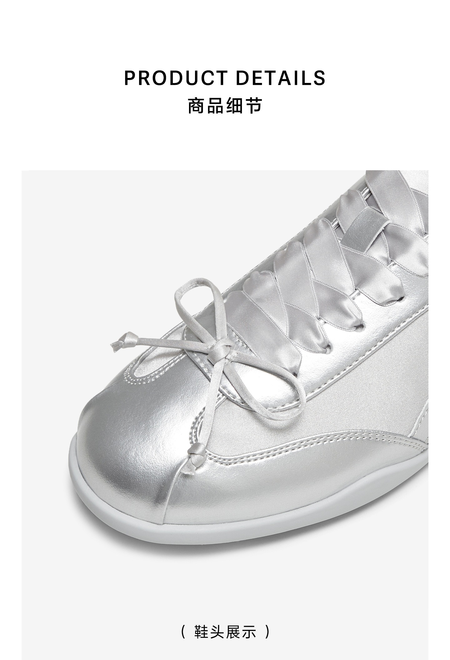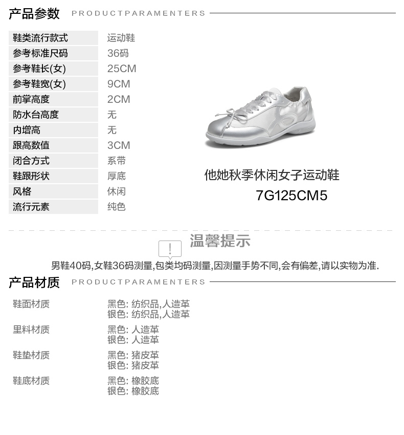 | 色系:银色 | 跟高数值:3CM | 性别:女子 | 里料材质:人造革 | 制鞋工艺:胶贴皮鞋 |