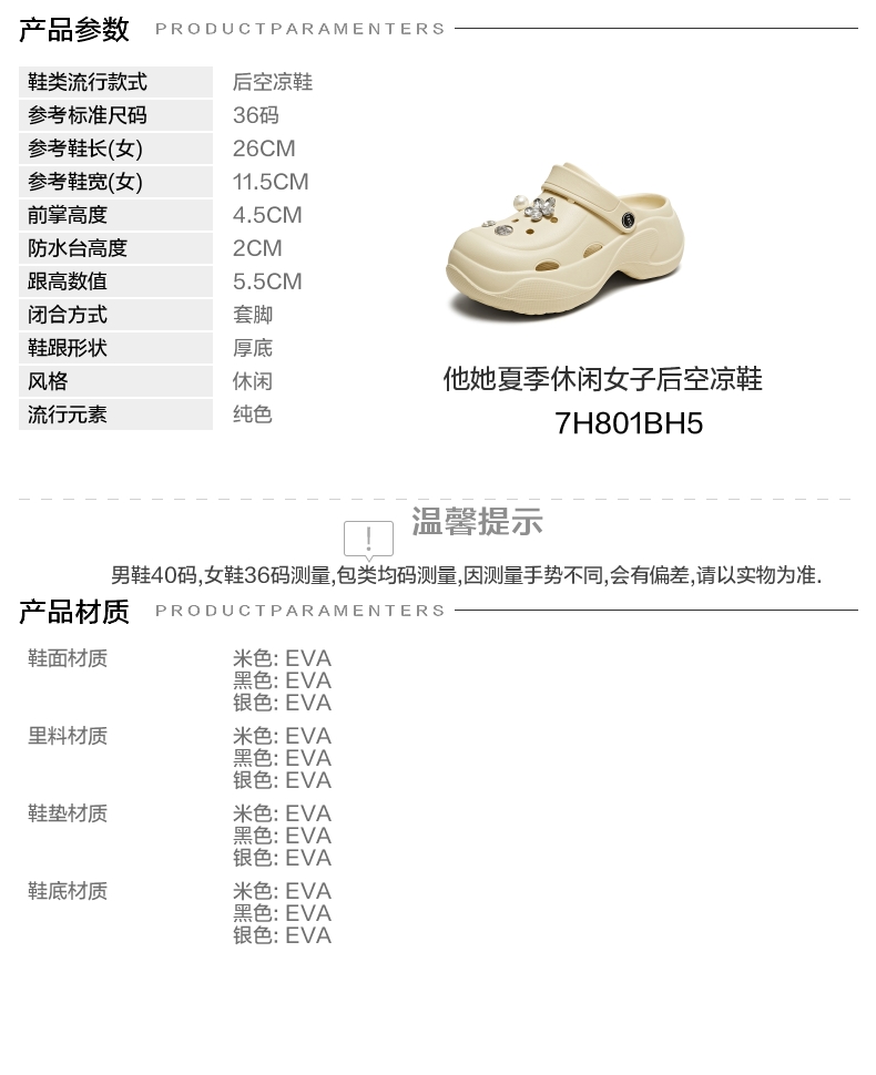 | 鞋头款式:套趾 | 鞋底材质:EVA | 鞋面图案:纯色 | 鞋跟形状:厚底 | 鞋面材质:EVA |