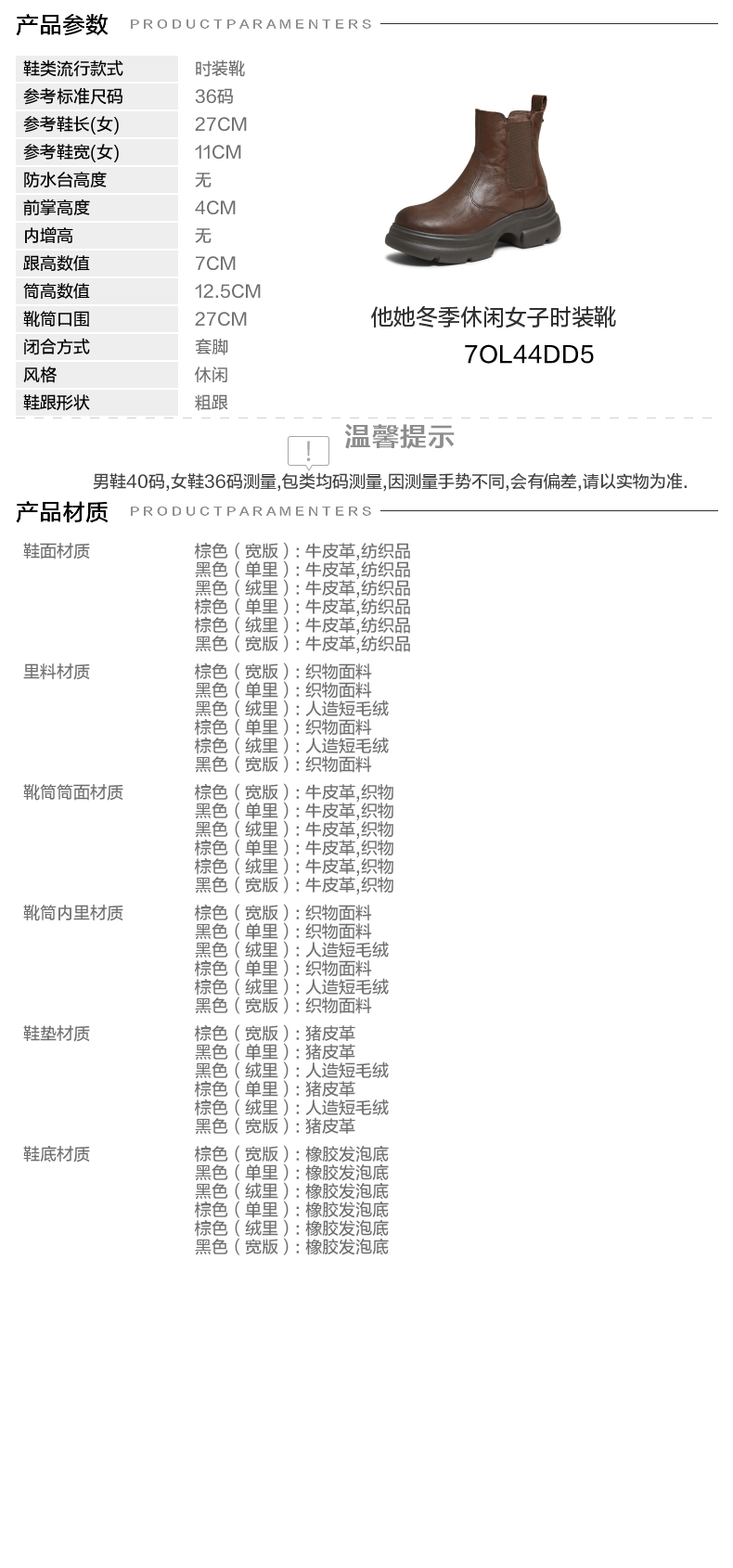 | 参考鞋宽(女):11CM | 风格:休闲 | 色系:棕色 | 跟高数值:7CM | 筒高数值:12.5CM |
