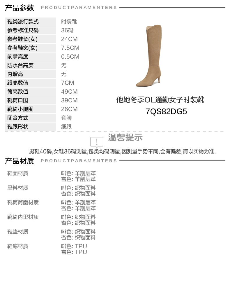 | 靴筒筒面材质:羊剖层革 | 靴筒小腿围:26CM | 里料材质:织物面料 | 制鞋工艺:胶贴皮鞋 | 鞋垫材质:织物面料 |