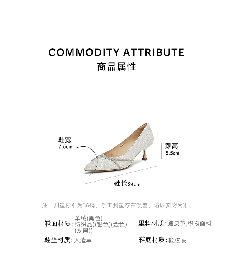 | 参考标准尺码:36码 | 跟高数值:5.5CM | 性别:女子 | 里料材质:织物面料猪皮革 | 制鞋工艺:胶贴皮鞋 |