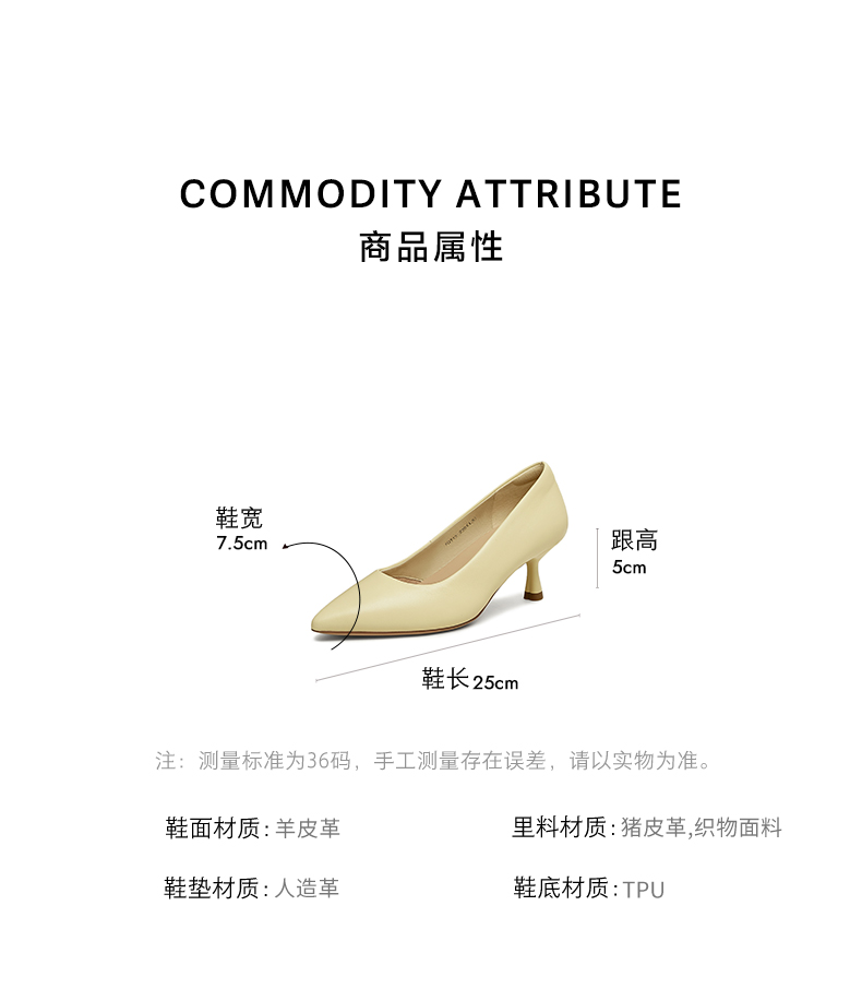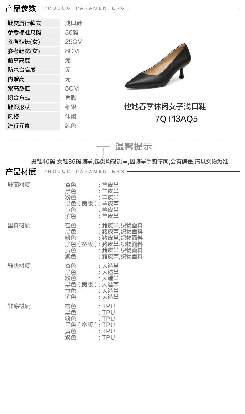 | 参考标准尺码:36码 | 跟高数值:5CM | 性别:女子 | 里料材质:织物面料猪皮革 | 制鞋工艺:胶贴皮鞋 |