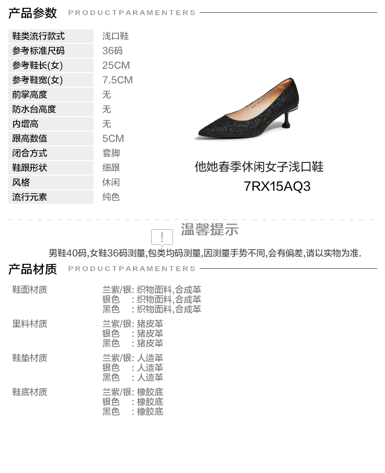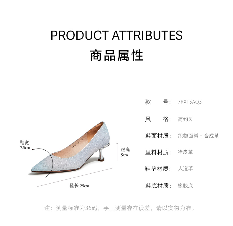 | 鞋类流行款式:浅口鞋 | 鞋头款式:尖头 | 执行标准:皮鞋 QB/T1002-2015 | 跟高范围:中跟鞋(3-5CM) | 鞋面图案:纯色 |