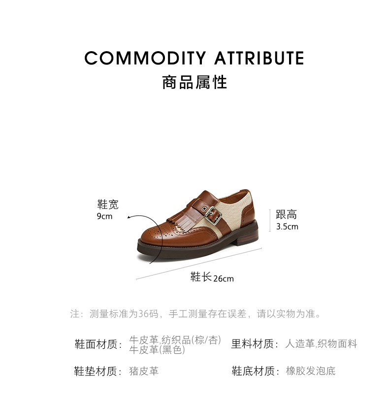 | 参考标准尺码:36码 | 跟高数值:3.5CM | 性别:女子 | 里料材质:织物面料人造革 | 制鞋工艺:胶贴皮鞋 |