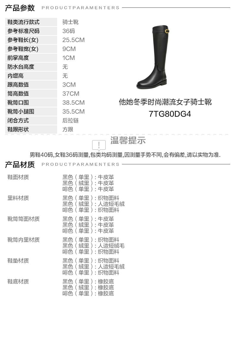 | 配跟:有 | 靴筒口围:38.5CM | 上市时间:2024年冬季 | 鞋类流行款式:骑士靴 | 鞋头款式:圆头 |