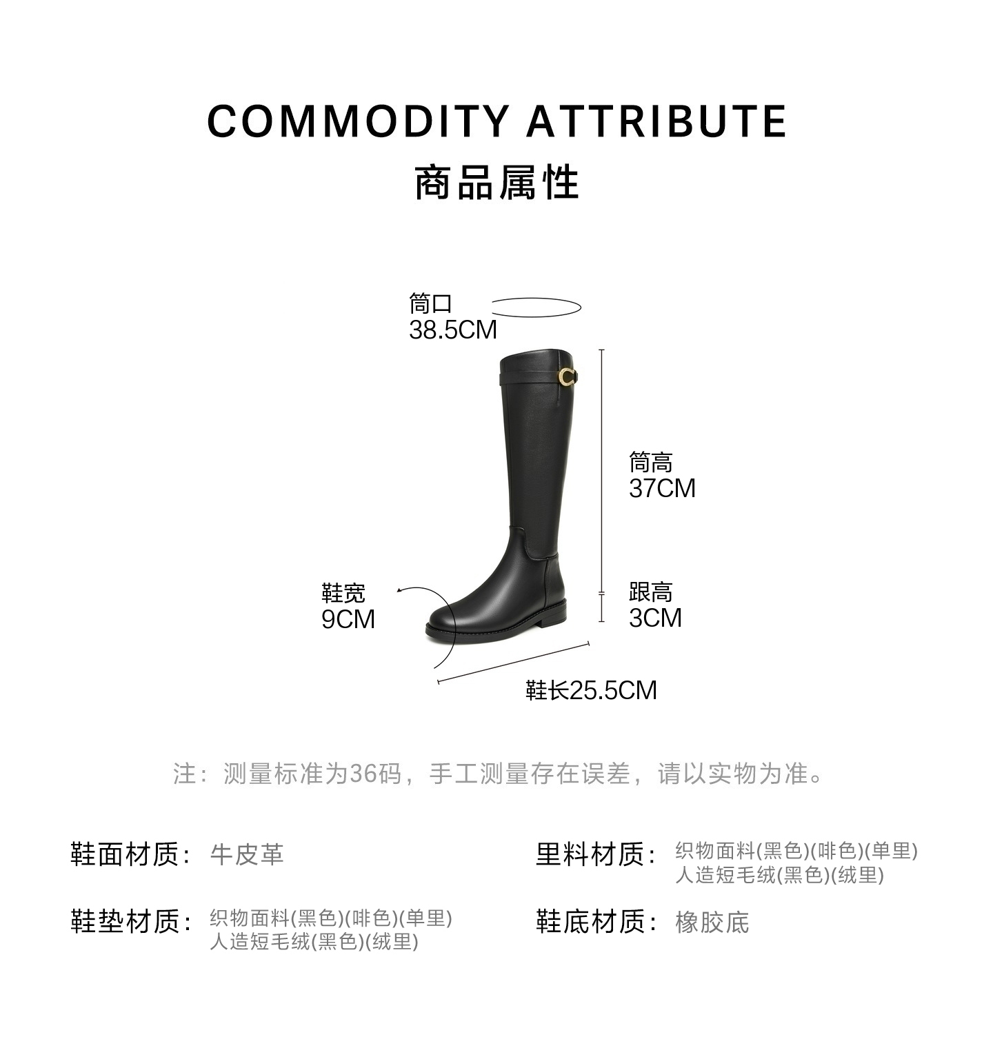 | 靴筒筒面材质:牛皮革 | 靴筒小腿围:35.5CM | 里料材质:织物面料 | 制鞋工艺:胶贴皮鞋 | 鞋垫材质:织物面料 |
