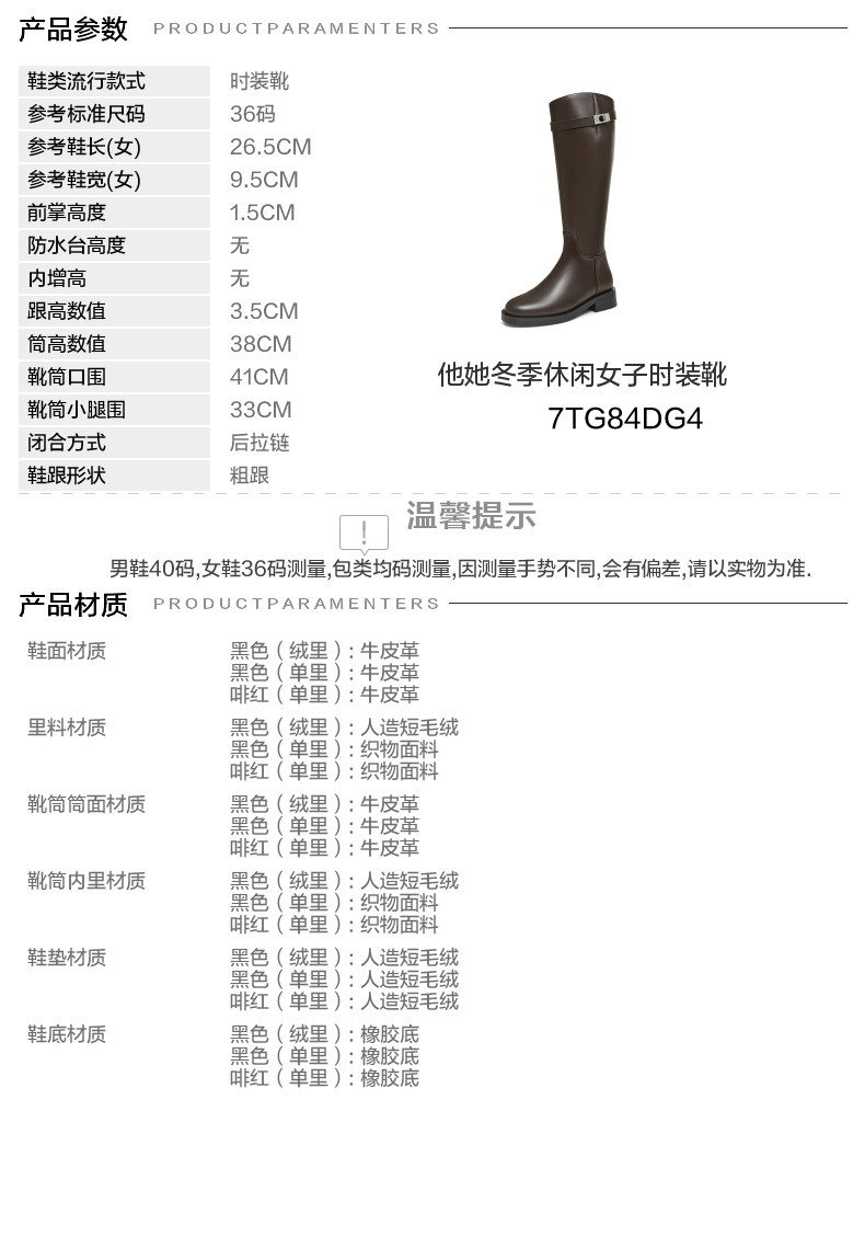| 靴筒筒面材质:牛皮革 | 靴筒小腿围:33CM | 里料材质:织物面料 | 制鞋工艺:胶贴皮鞋 | 款式季节:冬季 |