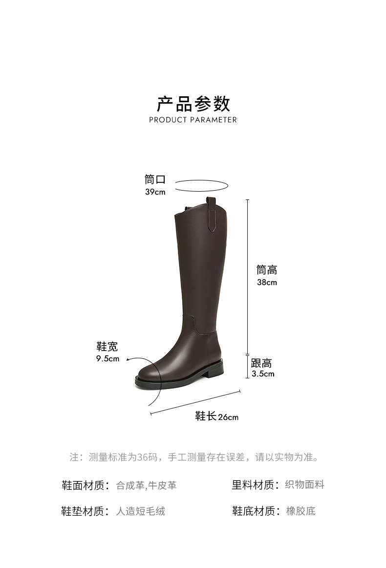 | 靴筒筒面材质:牛皮革合成革 | 靴筒小腿围:34CM | 里料材质:织物面料 | 制鞋工艺:胶贴皮鞋 | 款式季节:冬季 |