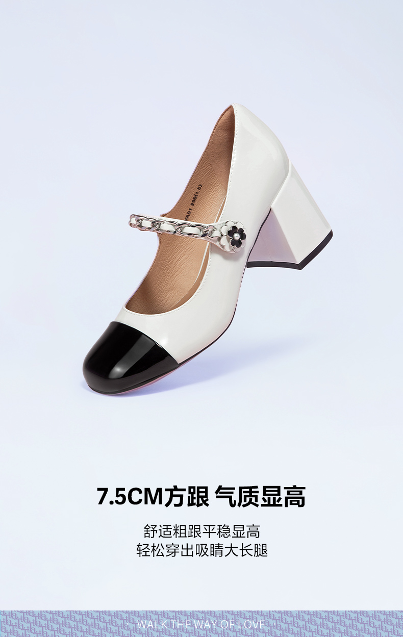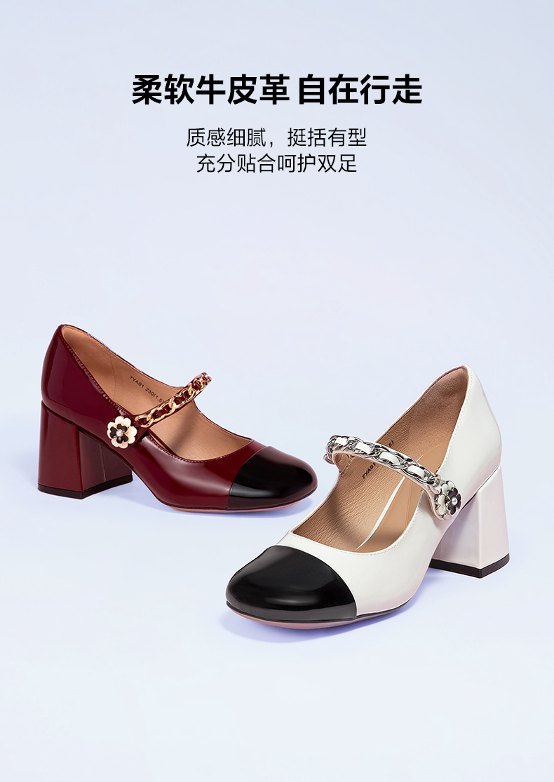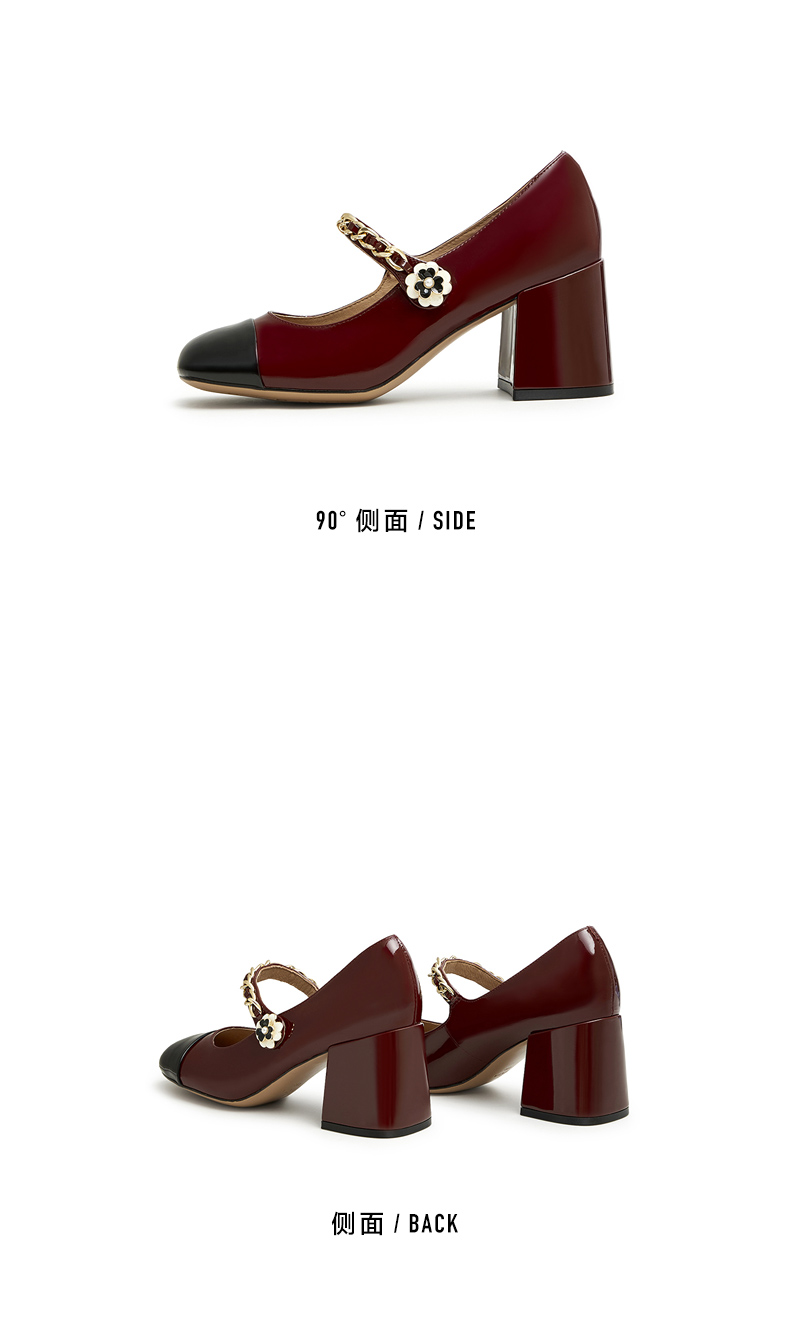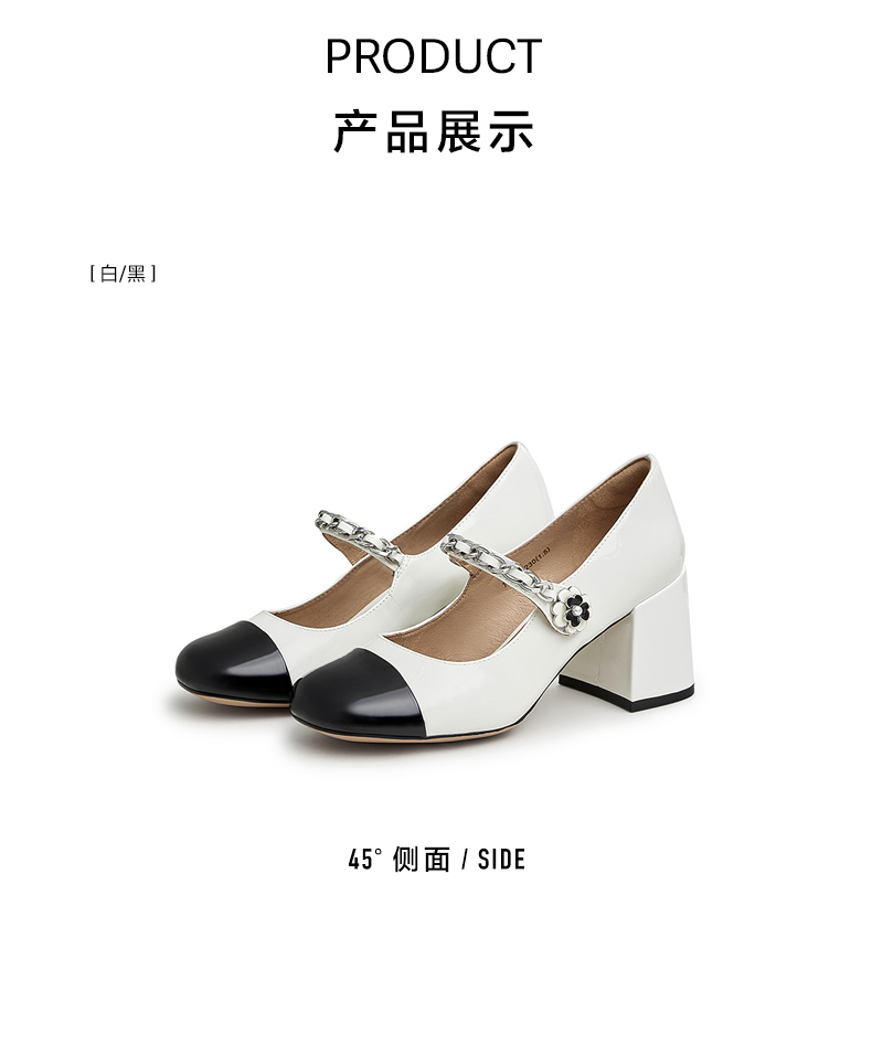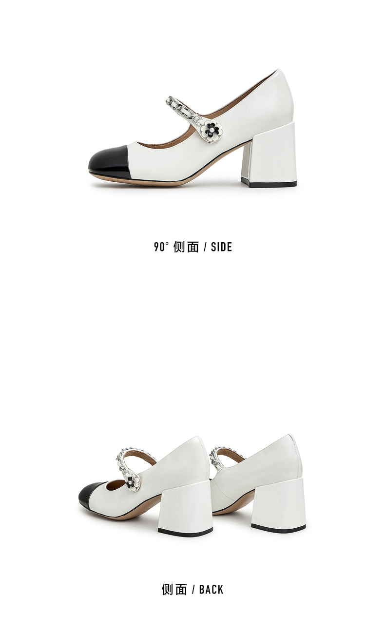 | 鞋类流行款式:玛丽珍鞋 | 鞋头款式:方头 | 执行标准:皮鞋 QB/T1002-2015 | 跟高范围:高跟鞋(6-8CM) | 鞋面图案:拼色 |
