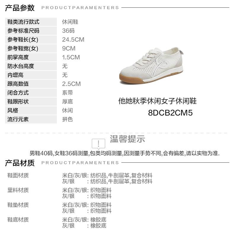 | 鞋跟形状:厚底 | 参考鞋长(女):24.5CM | 流行元素:拼色 | 参考鞋宽(女):9CM | 风格:休闲 |