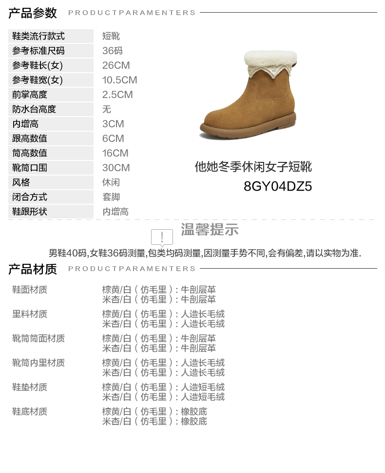 | 鞋底材质:橡胶底 | 靴筒内里材质:人造长毛绒 | 内增高:3CM | 鞋面材质:牛剖层革 | 闭合方式:套脚 |