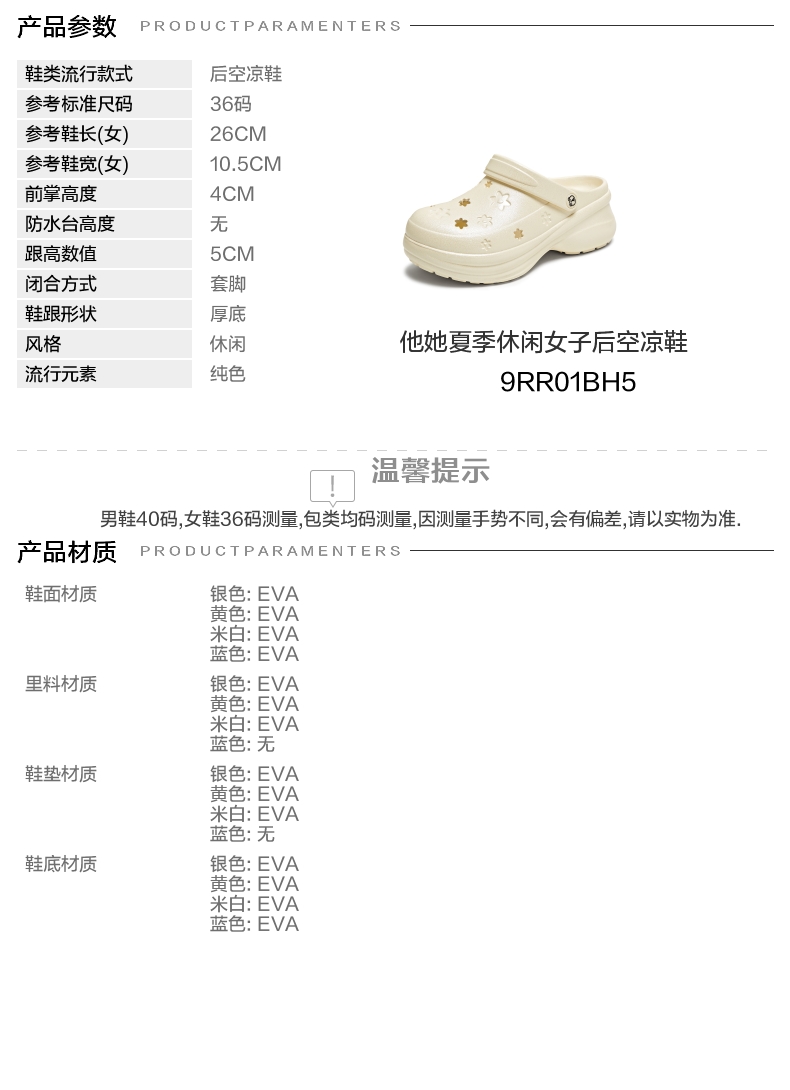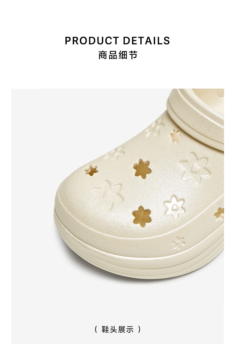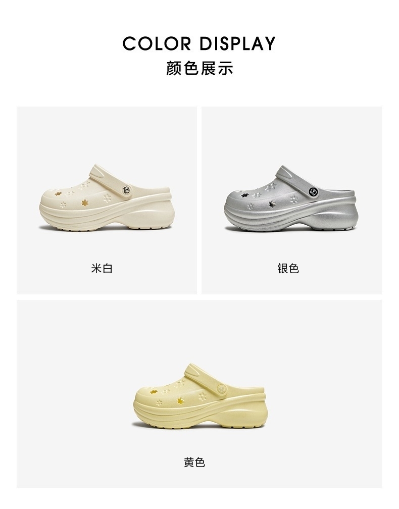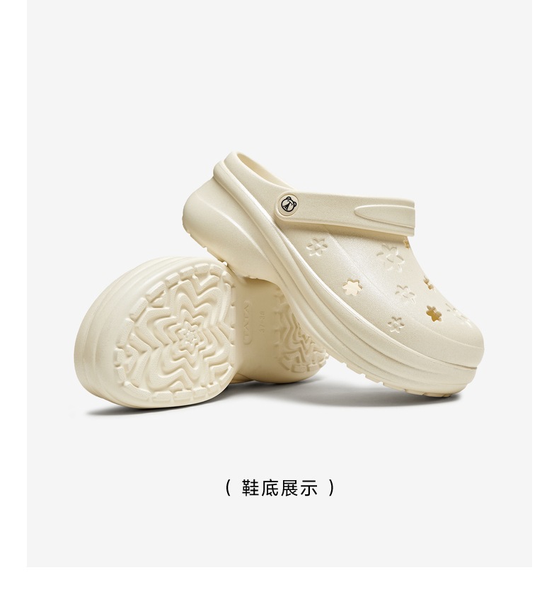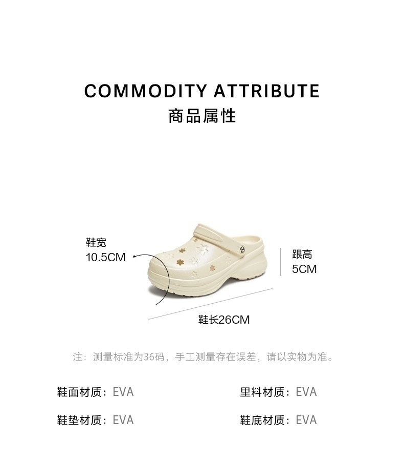 | 鞋头款式:圆头 | 鞋底材质:EVA | 鞋面图案:纯色 | 鞋跟形状:厚底 | 鞋面材质:EVA |