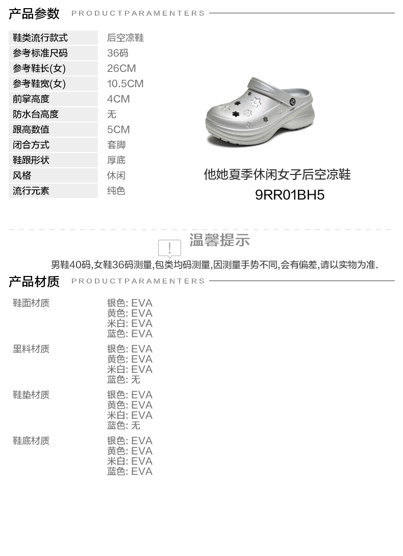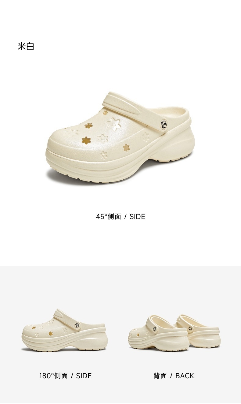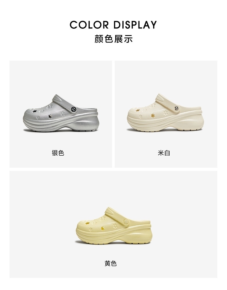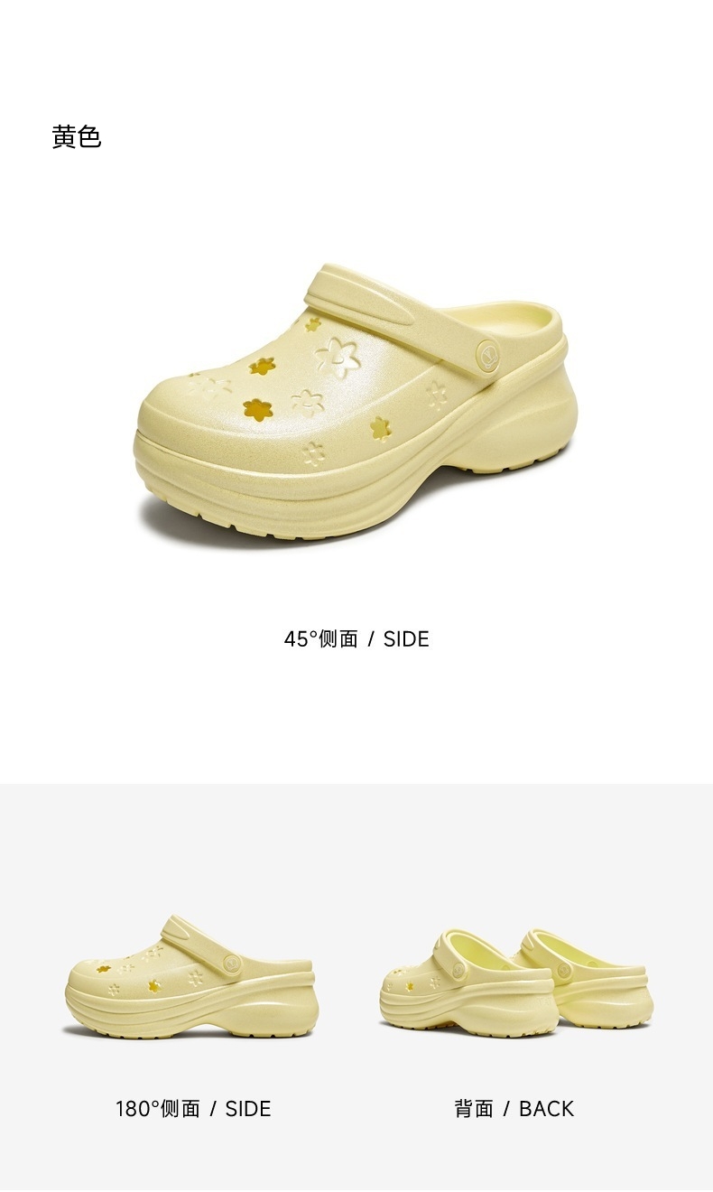 | 鞋头款式:圆头 | 鞋底材质:EVA | 鞋面图案:纯色 | 鞋跟形状:厚底 | 鞋面材质:EVA |