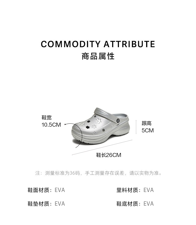 | 跟高数值:5CM | 色系:银色 | 配跟:无 | 性别:女子 | 里料材质:EVA |