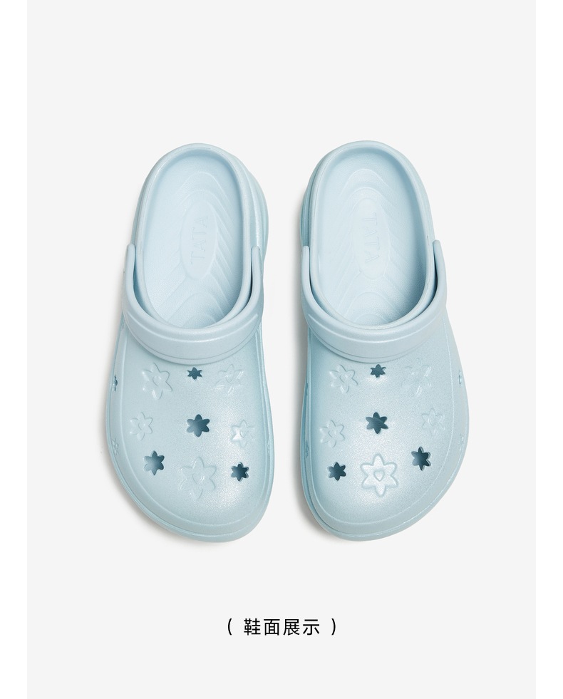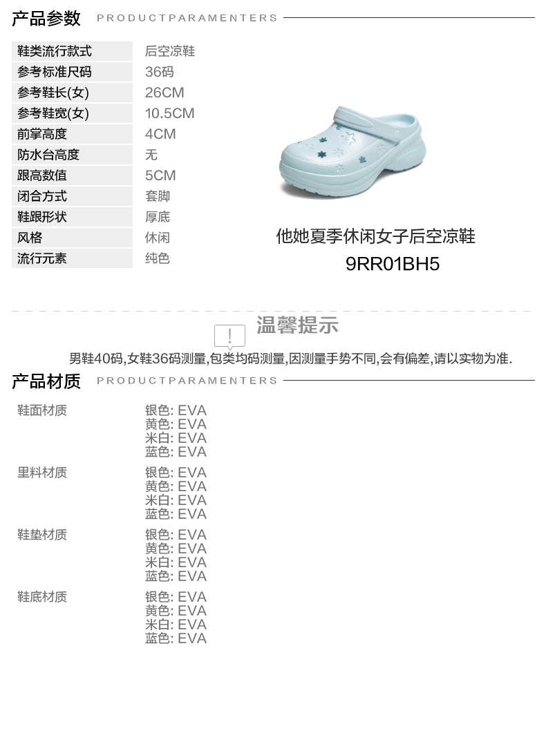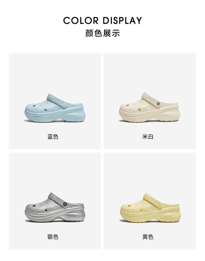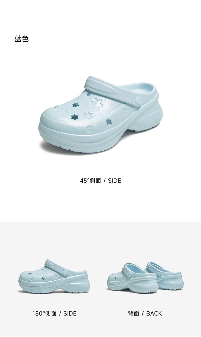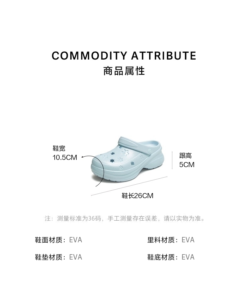 | 鞋头款式:圆头 | 鞋底材质:EVA | 鞋面图案:纯色 | 鞋跟形状:厚底 | 鞋面材质:EVA |