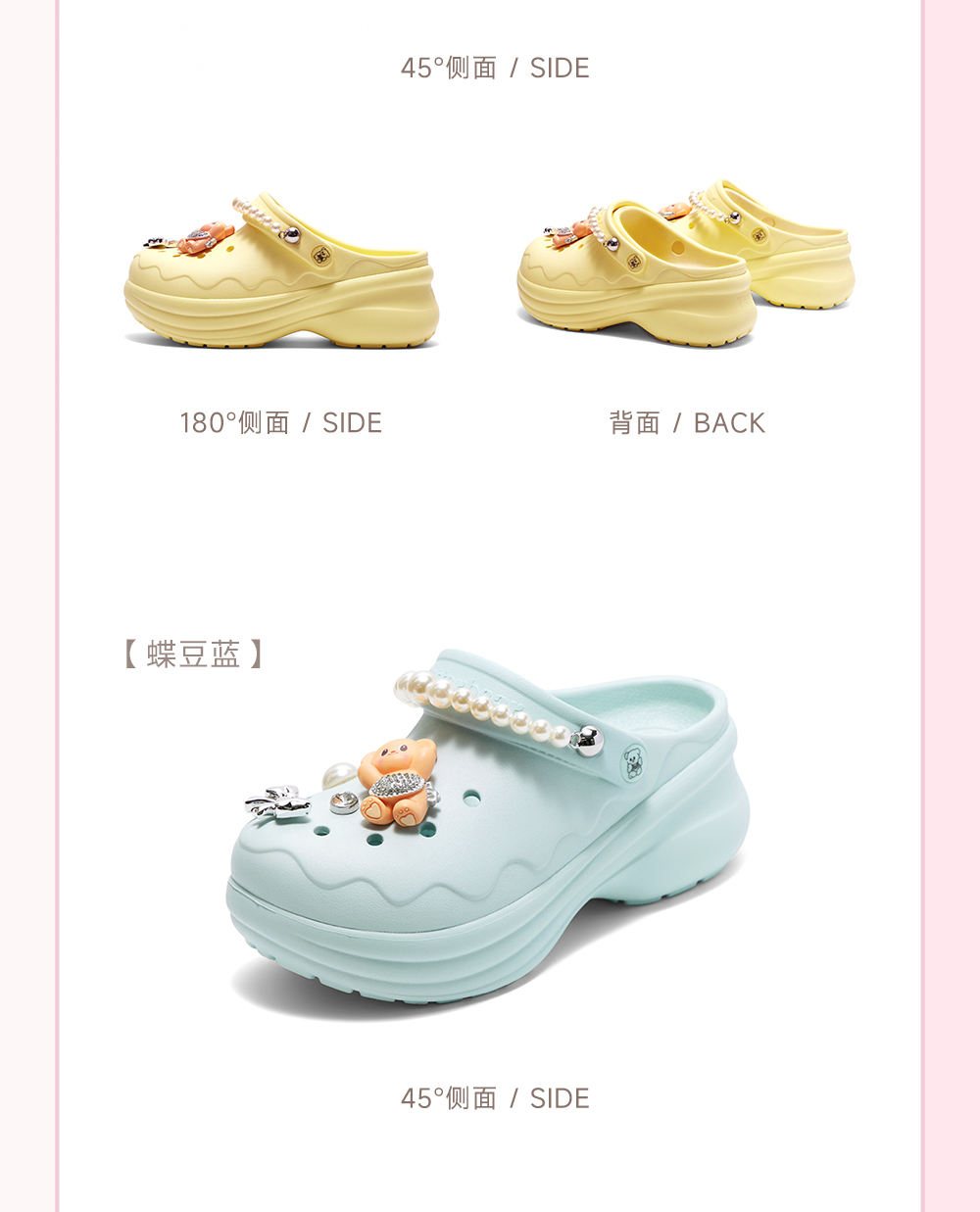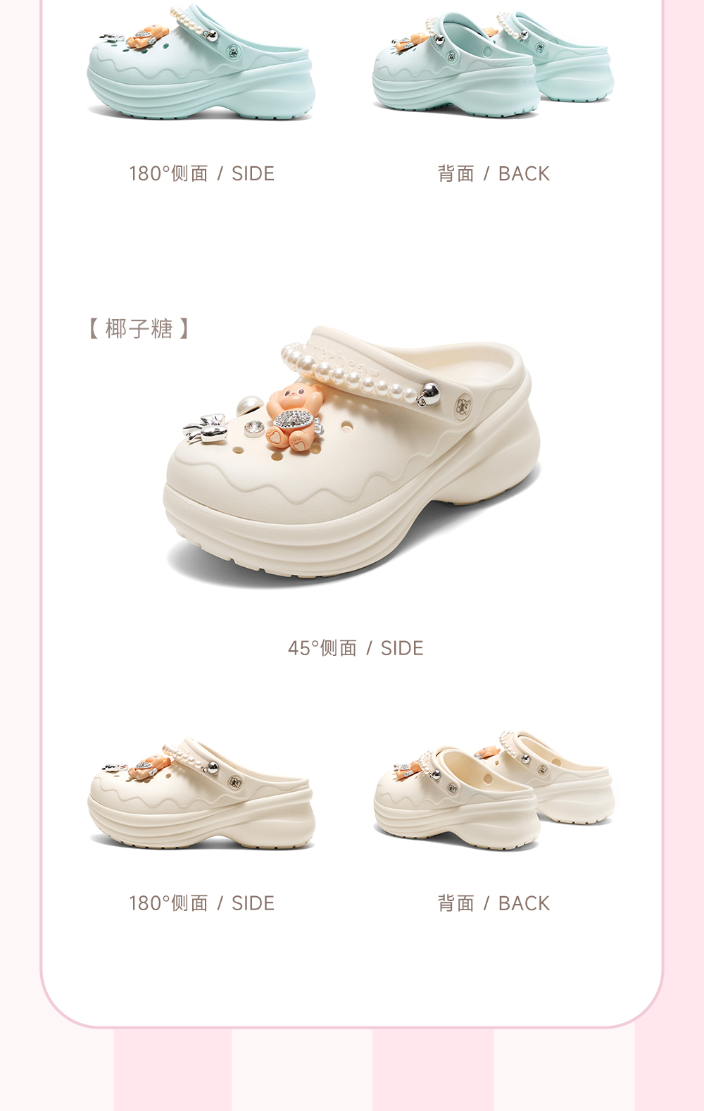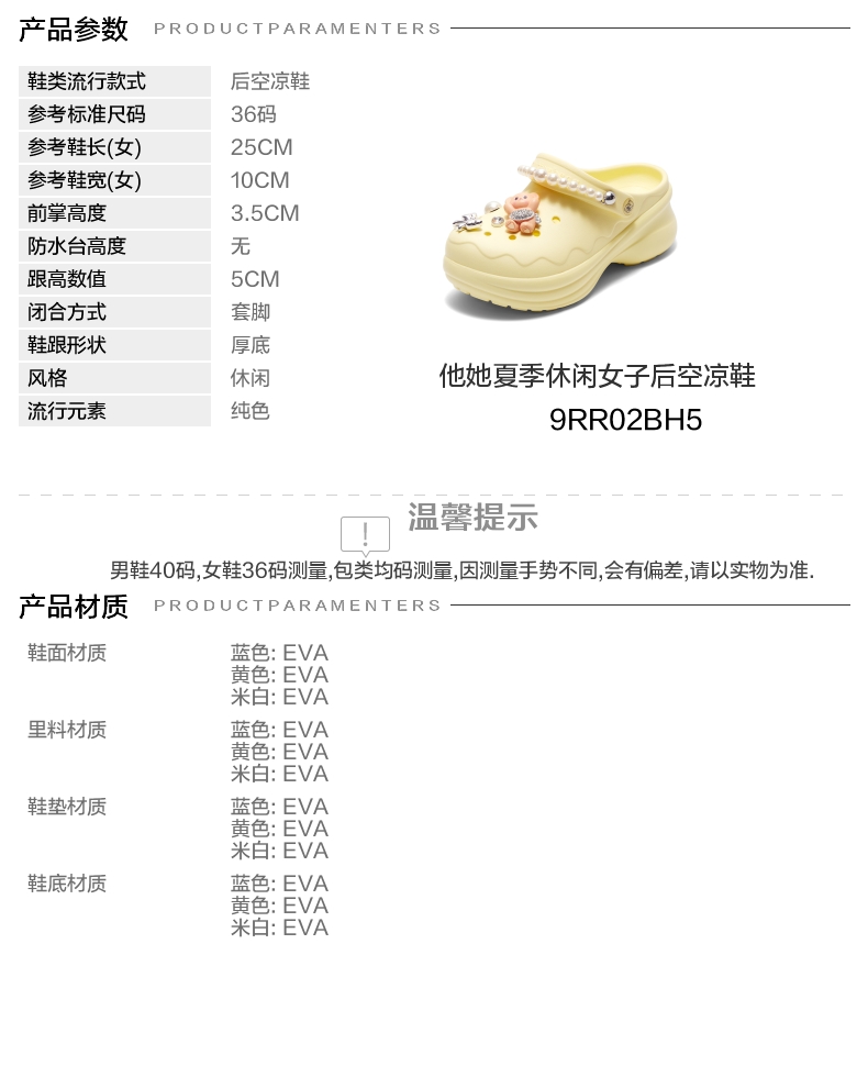 | 鞋头款式:圆头 | 鞋底材质:EVA | 鞋面图案:纯色 | 鞋跟形状:厚底 | 鞋面材质:EVA |