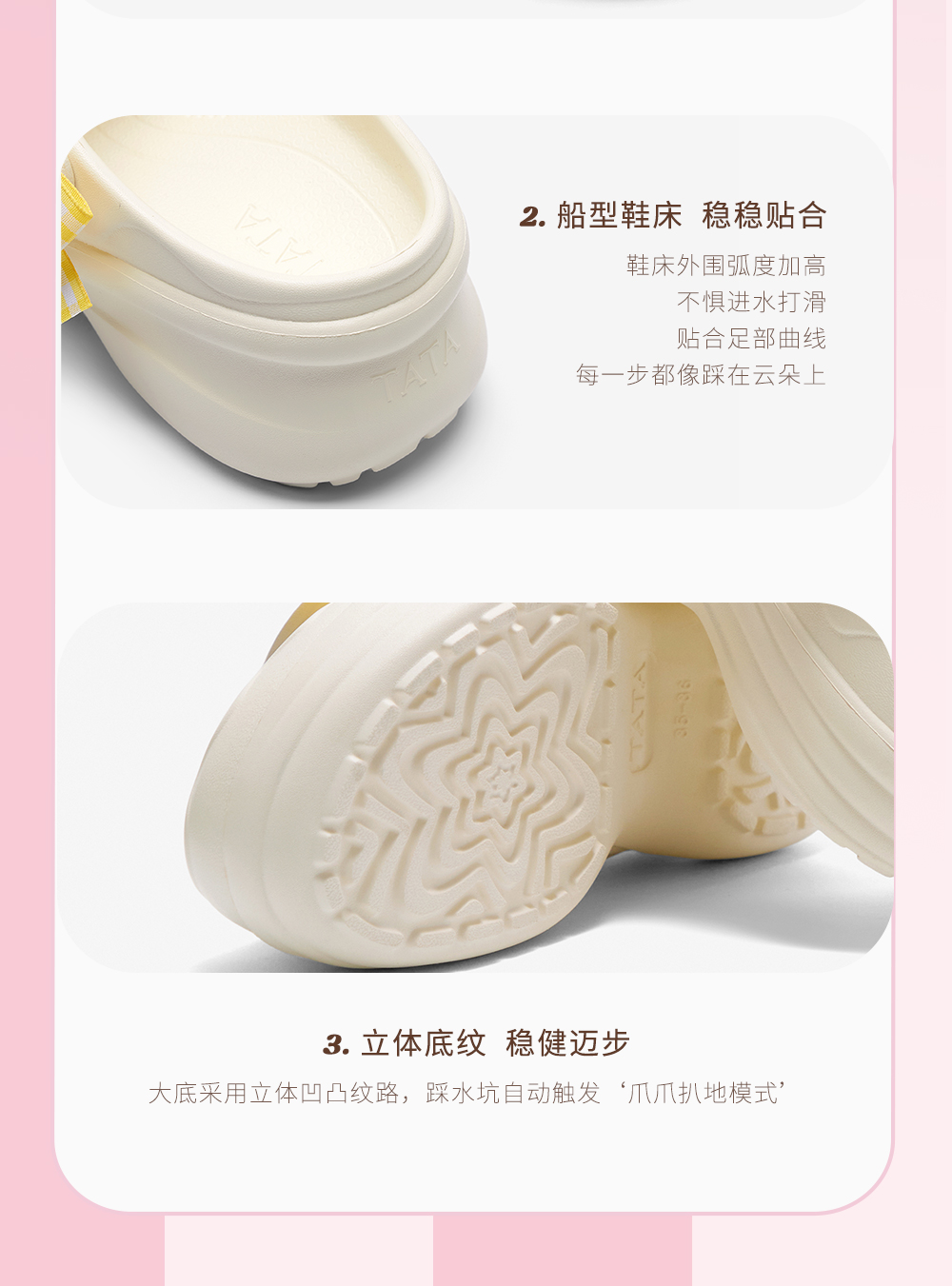 他她(Tata),品牌成立于2003年,致力为都市年轻人群提供时尚潮流、具有性价比的鞋履产品。十五年来“踏踏”的着地声,寓意都市白领元气满满的生活,如时尚“伴履”的TATA一直陪伴左右、伴随走出TATA的时尚步伐。2017年TATA美丽蜕变,TATA STAR元素的加入预示品牌将成为闪亮、前端的时尚鞋履品牌。