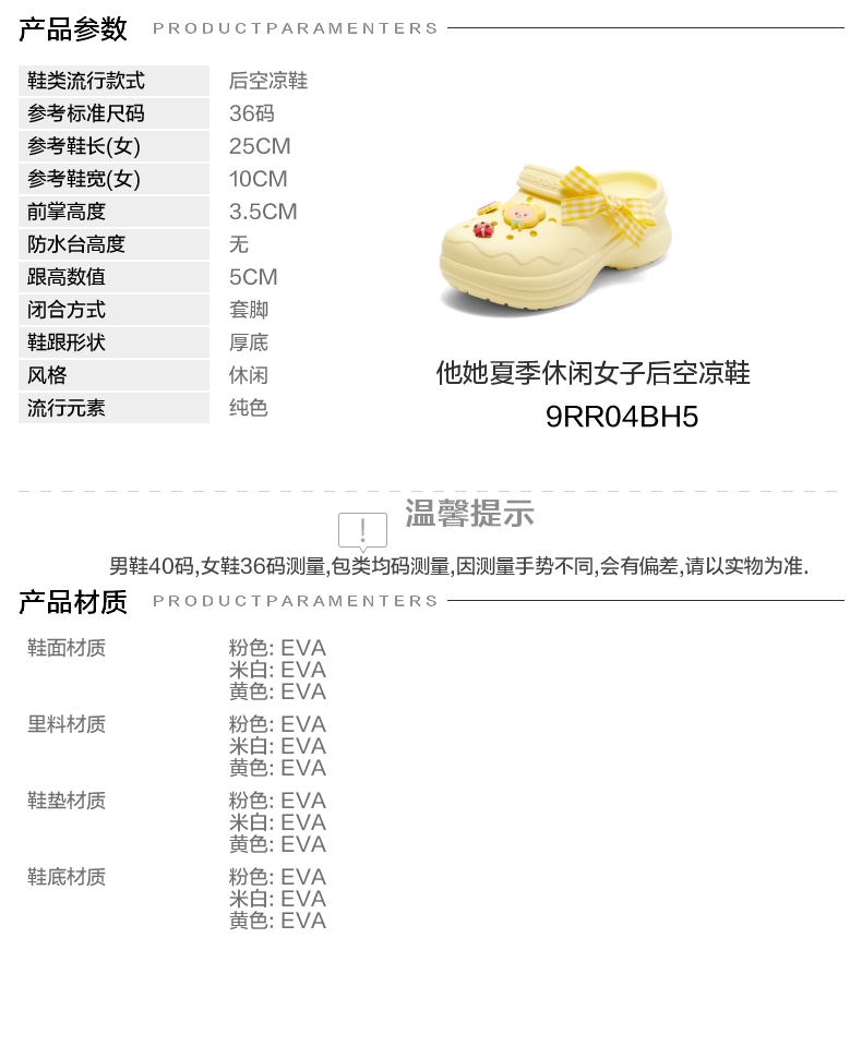 | 跟高数值:5CM | 色系:黄色 | 配跟:无 | 性别:女子 | 里料材质:EVA |