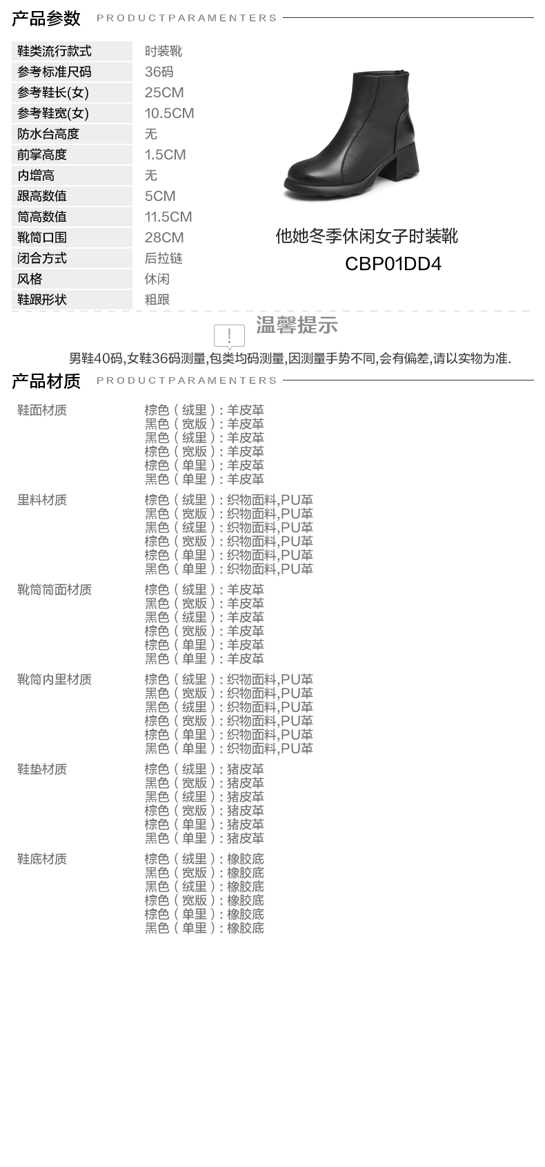 | 参考鞋宽(女):10.5CM | 风格:休闲 | 色系:黑色 | 跟高数值:5CM | 筒高数值:11.5CM |