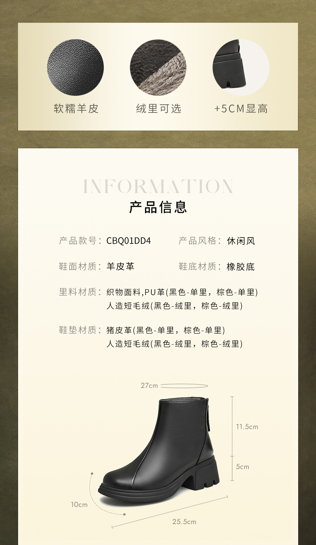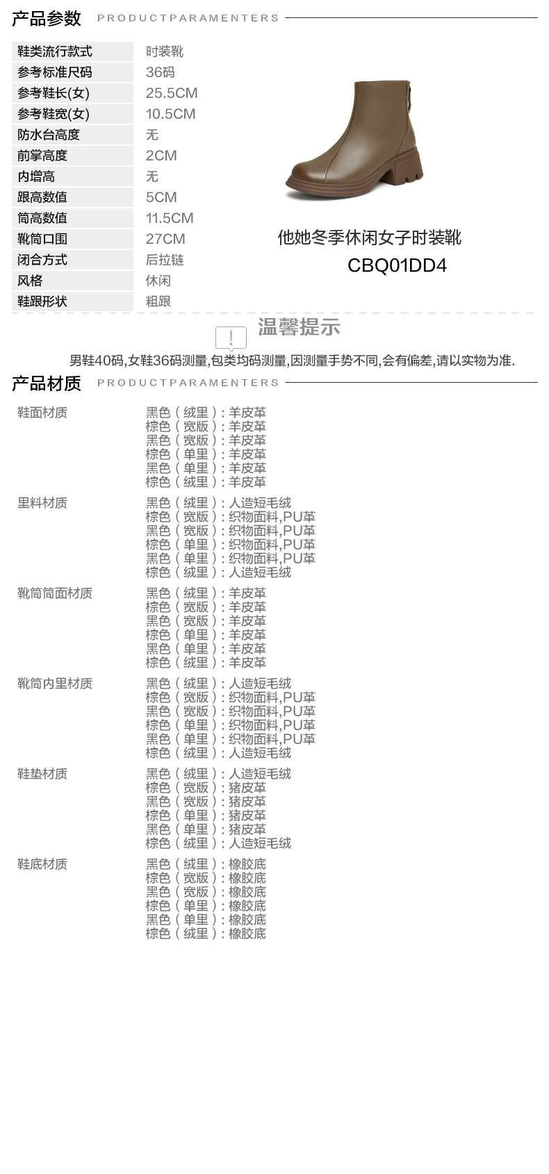 | 参考鞋宽(女):10.5CM | 风格:休闲 | 色系:黑色 | 跟高数值:5CM | 筒高数值:11.5CM |