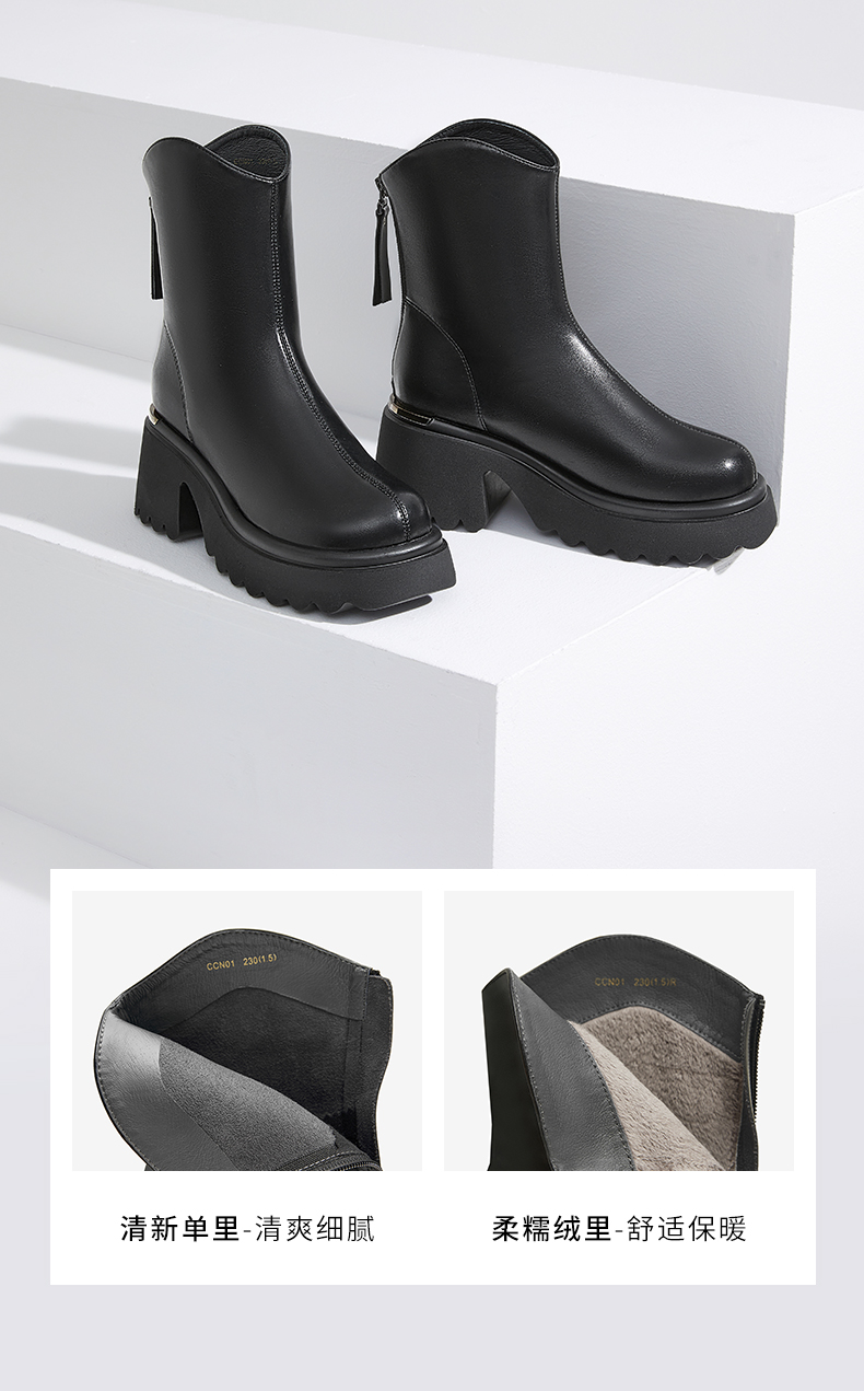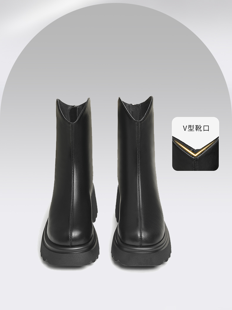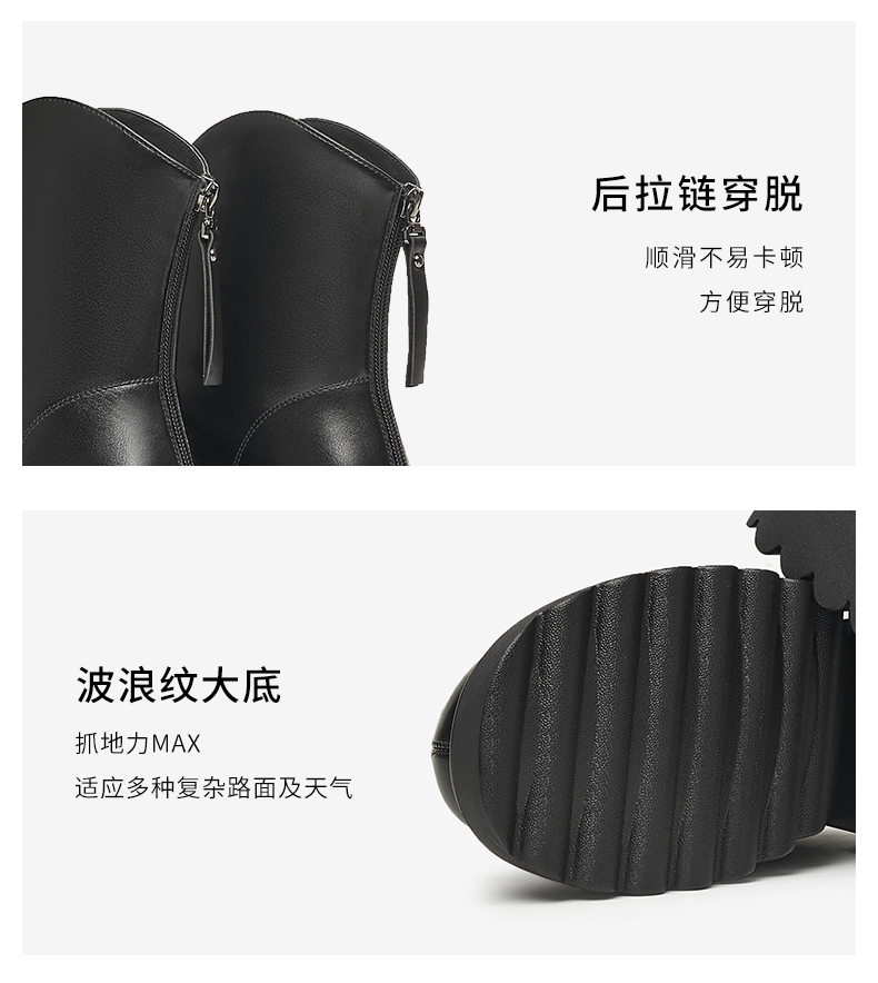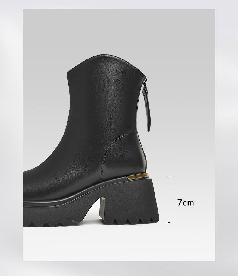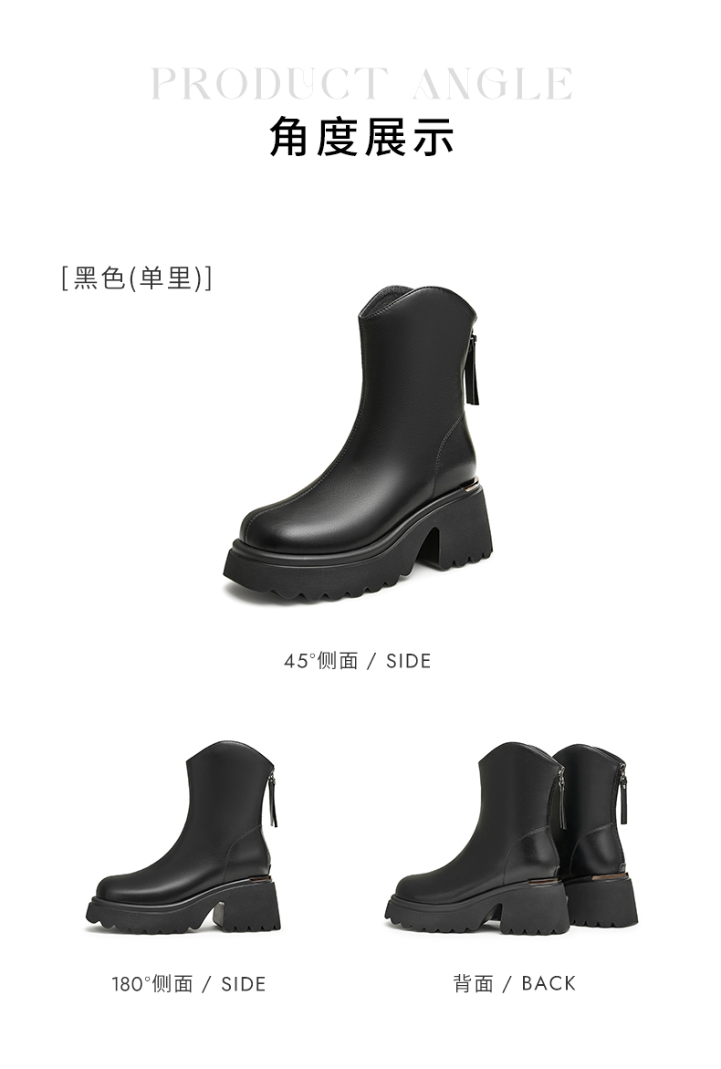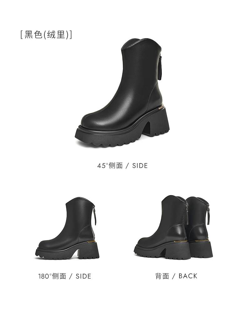 | 鞋底材质:PU | 靴筒内里材质:人造革织物面料 | 内增高:无 | 鞋面材质:人造革 | 闭合方式:后拉链 |