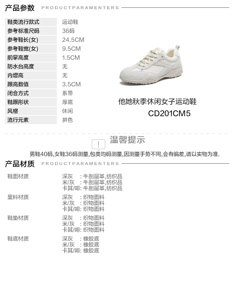 | 鞋跟形状:厚底 | 参考鞋长(女):24.5CM | 流行元素:拼色 | 参考鞋宽(女):9.5CM | 风格:休闲 |